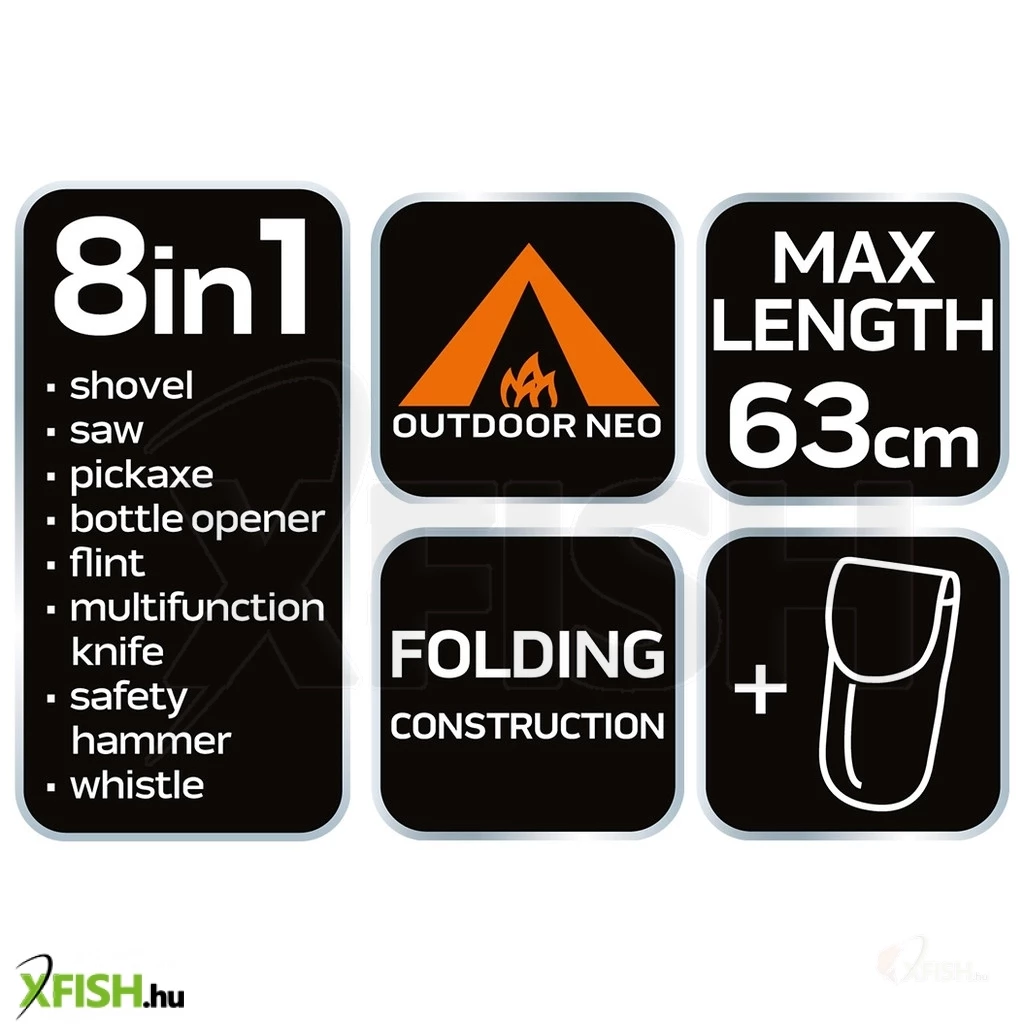 KategóriákKategóriákKerti bútorok, medencék Székek, padok Neotools multifunkciós túlélő tábori ásó, 63cm, ásó, fűrész, csákány, palacknyitó, kovakő, kés, üvegtörő, síp