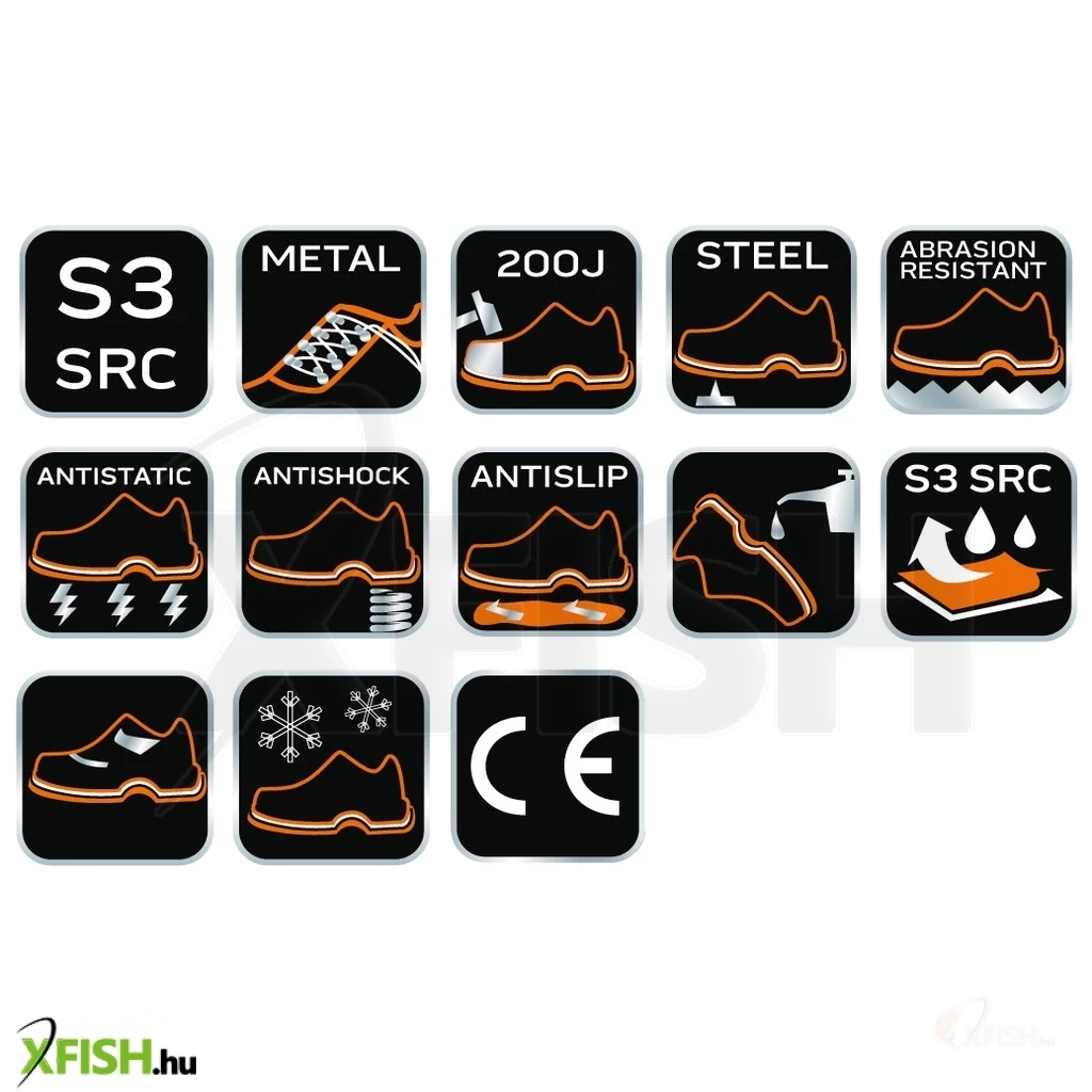 A bélés extra meleget nyújt hideg időben, míg a belső acélbetét és a 200J ütésálló acél orr a legmagasabb fokú védelmet nyújtja a sérülésekkel szemben, így a láb mindig biztonságban van. A bakancs ellenáll az olajoknak, benzineknek és különböző vegyszereknek, növelve ezzel tartósságát és funkcionalitását. Az S3 SRC jelölés igazolja a legmagasabb szintű védelem és csúszásgátlás meglétét, míg az antielektrosztatikus tulajdonság biztonságot nyújt elektromos kisülések ellen is.