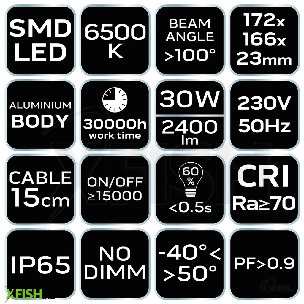 A lámpatest dizájnját is szem előtt tartva, négyszögletes fali rögzítő konzollal van felszerelve, amely az egyszerű és stabil rögzítést teszi lehetővé. A teljesítmény szempontjából a 30 W-os reflektor SMD LED technológiával biztosítja az energiatakarékos működést. A 2400 lumen fényerő és 6500 K színhőmérséklet együtt lenyűgöző fényviszonyokat teremt. A készülék ki- és bekapcsolási ciklusainak száma 15 000, az üzemidő pedig akár 30 000 óra, ami garantálja a hosszú távú használatot.