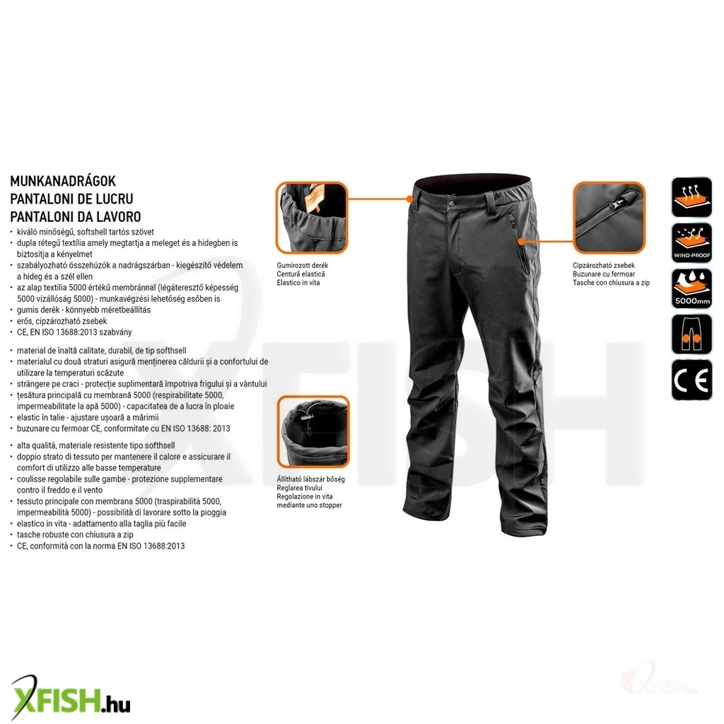 A Neotools softshell munkásnadrág tökéletes választás mindazok számára, akik a szabadban végzett munka vagy éppen az outdoor kalandok során is maximális kényelmet és védelmet keresnek. Az ergonomikus kialakítású nadrág kiváló minőségű softshell anyagból készült, mely egyesíti a vízállóságot és a légáteresztést, így biztosítva a horgászok számára az optimális komfortérzetet. A munkásnadrág 5000 mm-es vízállósággal büszkélkedhet, amely garantálja a szárazság érzetet még a legnedvesebb környezetben is, miközben a légáteresztő tulajdonság lehetővé teszi a megfelelő szellőzést, így elkerülve a túlzott izzadást.