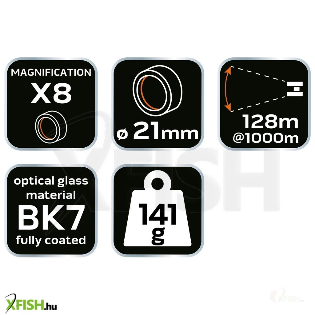 A távcső 8-szoros nagyítási képessége és 21 milliméteres keresője részletes és éles képet nyújt, ami lehetővé teszi a távoli pontyok, madarak vagy egyéb érdekes észlelni kívánt tárgyak könnyed megfigyelését. A minőségi optikai lencsék biztosítják a tiszta és világos látványt, még rosszabb fényviszonyok között is. A kompakt távcső ideális választás azok számára, akik előnyben részesítik a praktikumot és a hordozhatóságot.