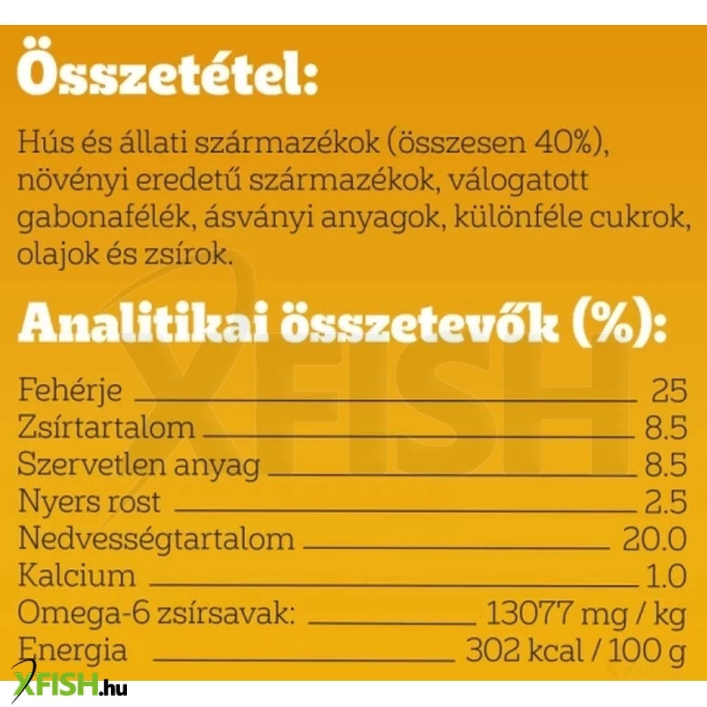 Fehérje 28%, zsír 12%, szervetlen anyag 9%, nyersrost 2,3%, nedvesség 17,5%, energia 330 kcal/100 g, kalcium 1,2%, Omega-3 zsírsavak 1300 mg/kg.
