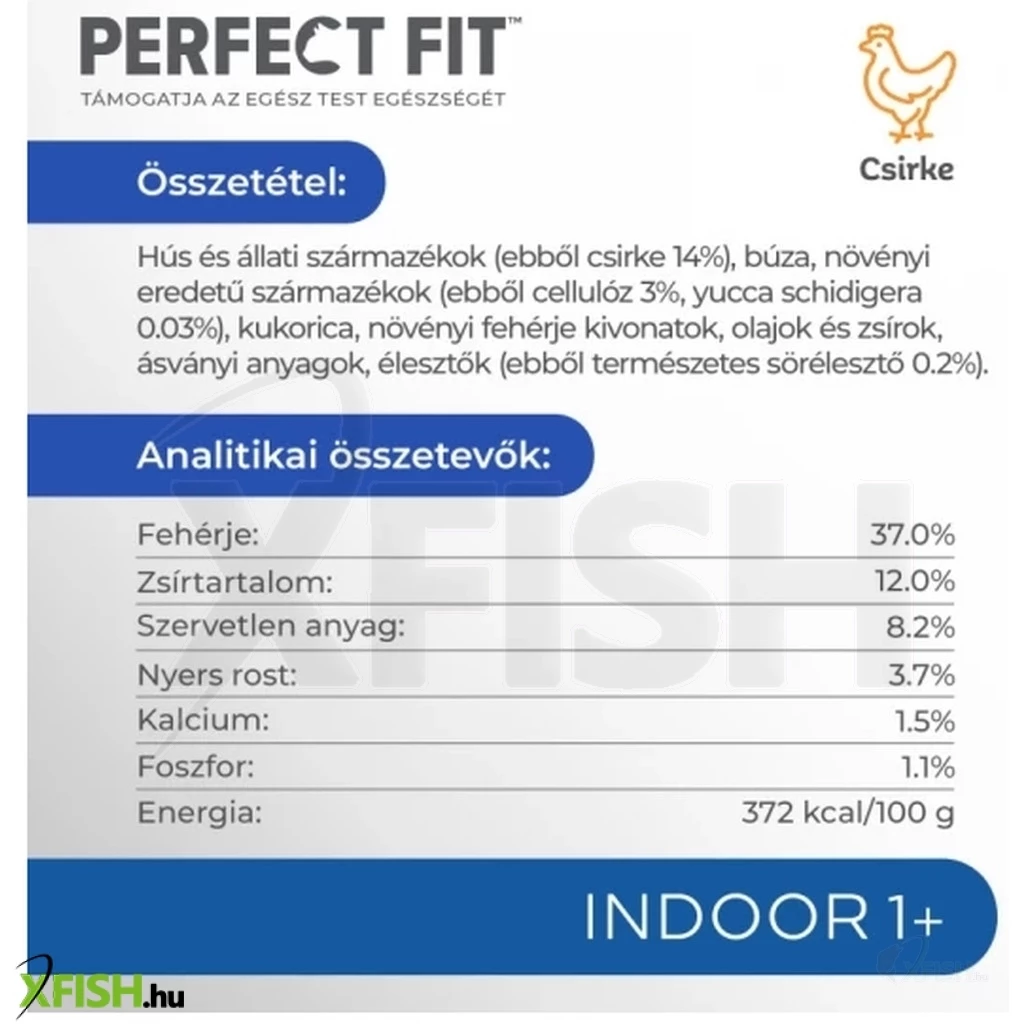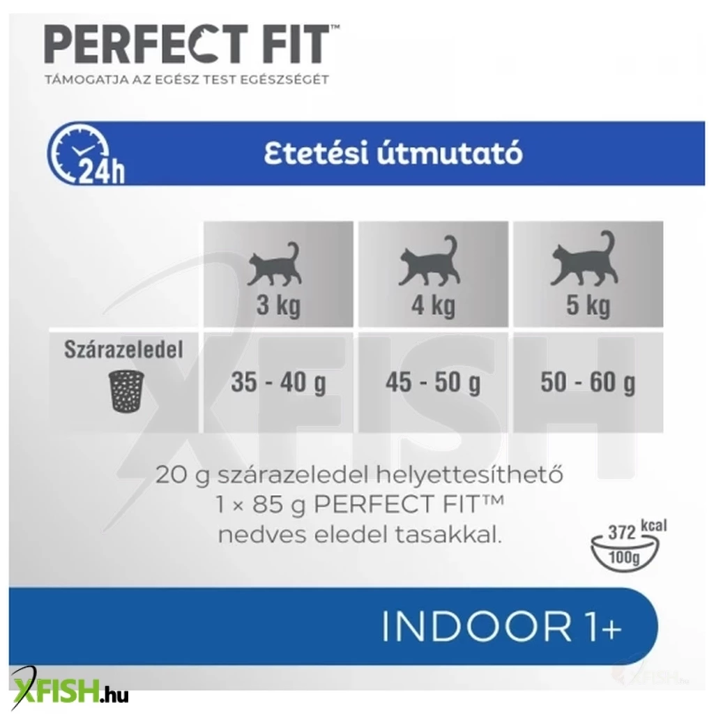 Etetési útmutató: 3kg-os cicának 35 - 40g, 4kg-os cicának 45-50g, 5 kg-os cicának 50-60g szárazeledel naponta. 20 g szárazeledel helyettesíthető 1 db 85 g Perfect Fit nedves eledel tasakkal. Számolja a jutalomfalatokból származó kalóriát. Az etetési mennyiségek csak iránymutatásként szolgálnak. A macska életkorának, méretének és aktivitási szintjének megfelelően határozza meg az eledel mennyiségét. Az egész napos etetéshez ossza el adagokra. Kérjük, étrendváltáskor fokozatosan vezesse be az eledelt. További információkért kérjük, látogasson el weboldalunkra. Kínáljon hozzá friss vizet. Száraz, hűvös helyen tárolandó.