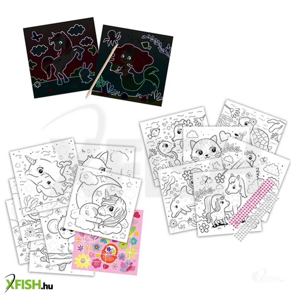 Tartalma: 7 x oldal csillogó matrica és színező, 6 x oldal gyöngy mozaik és színező, 2 x oldal csillogó karc, 1 x lap rózsaszín és fehér gyöngy, 1 x lapos csillogó matrica, 1 x karcoló toll.