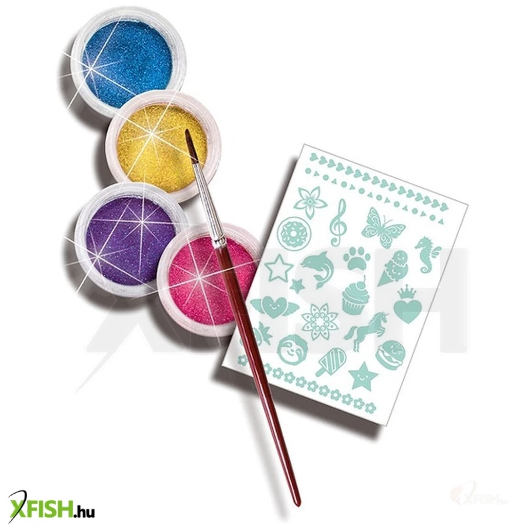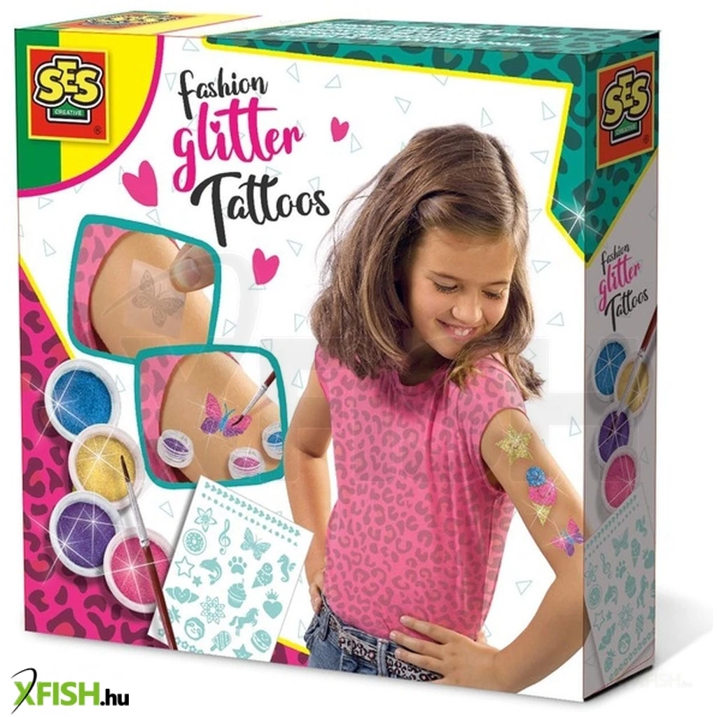 Készíts magadnak egyedi, csillogó tetoválásokat! A Ses Divatos csillámtetoválás készlet sablonokat, színes csillámot és egy ecsetet is tartalmaz, amikből bőrre ragasztható matricákat lehet megalkotni. A matricákat először fel kell ragasztani a bőrfelületre, és miután lehúztad a védőfóliát, ragadd meg az ecsetet, mártsd a csillámporba, és vidd fel a réteget. A csillámos tetkókkal új divatot teremthetsz, a készlet négy különböző színt tartalmaz. A Divatos csillámtetoválás készlet csomagolási méretei: 20 x 4 x 20 cm.