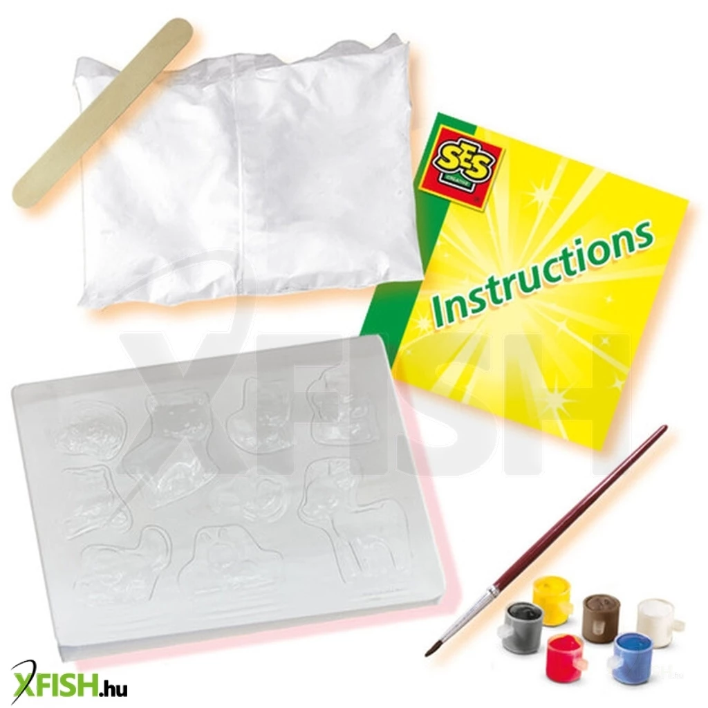 Tartalom: 2 tasak gipszpor, 4 db öntőforma, 5 db különböző színű festék, 1 db ecset, 1 db vizes tégely