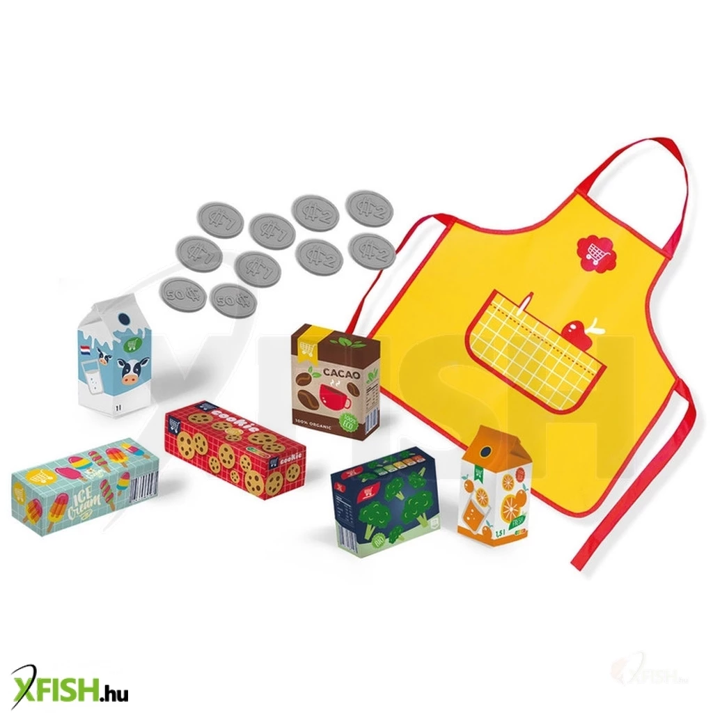A csomagban találsz egy bolti eladóknak való köpenyt, hasonlóval védik a ruhájukat a való életben is, játék ételeket, italokat, ezeket el tudod adni a vásárlóidnak és még azt is el tudjátok játszani a játékpénzekkel, hogy kifizetik neked a termékeket, te pedig visszaadod a visszajárót.