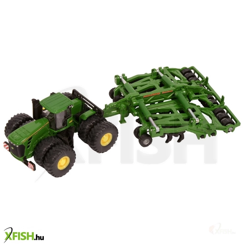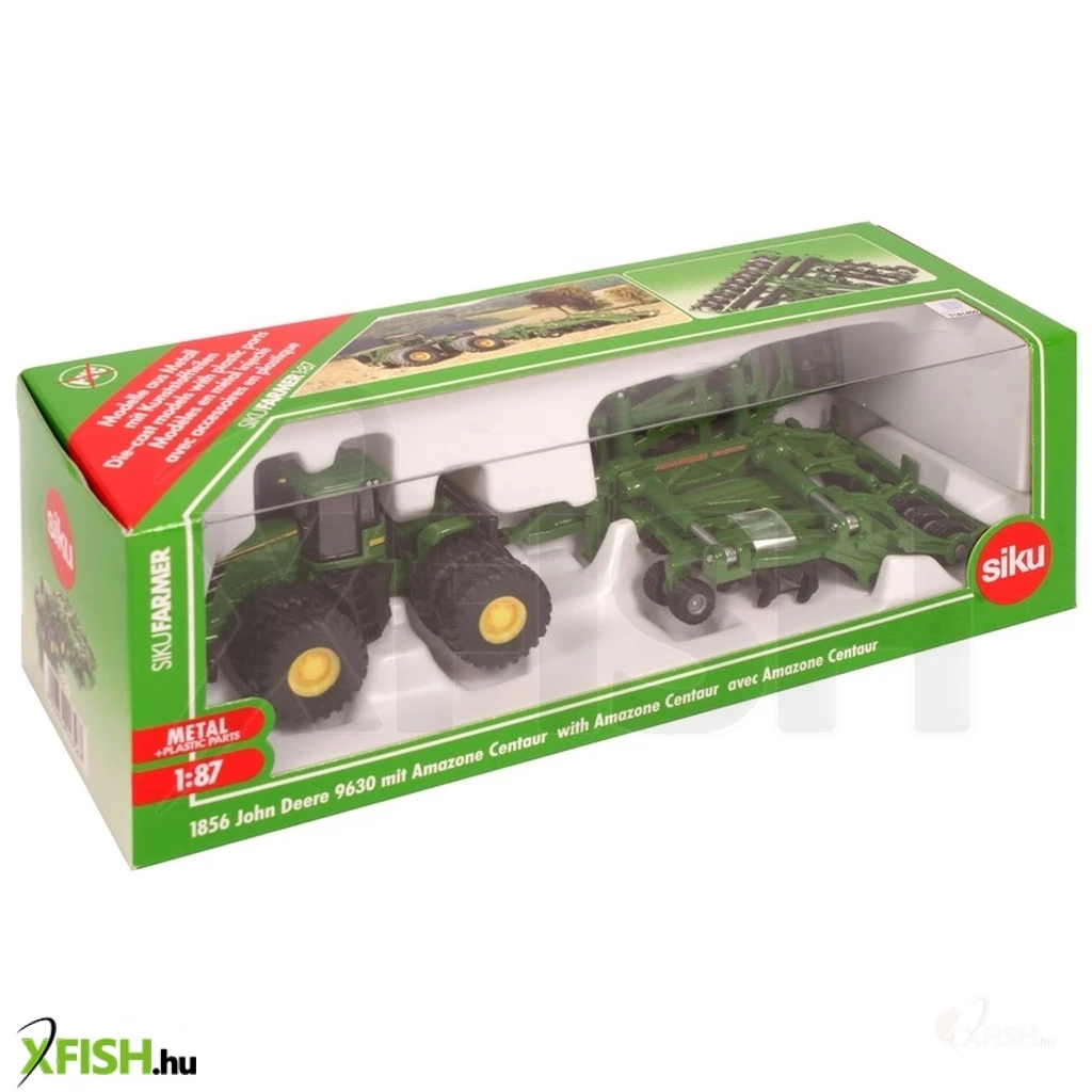 Sötétzöld, dupla kerekű John Deere 9630 traktor Amazone Centaur rotációs kapa utánfutóval. A Siku: John Deere 9630 traktor Amazone Centaur utánfutóval készlet traktora az erős mezőgazdasági gép 1:87 méretarányú kicsinyített mása. A traktor dupla kerekekkel van felszerelve, hogy könnyen tudjon haladni a tarlón. A csomag tartalmaz egy fém és műanyag Amazone Centaur utánfutót is, rotációs kapával felszerelve. Az utánfutó összecsukható, hogy könnyebben szállítható legyen, az alkatrészei forognak. Traktor és utánfutó mérete: 20 x 8 x 4 cm.