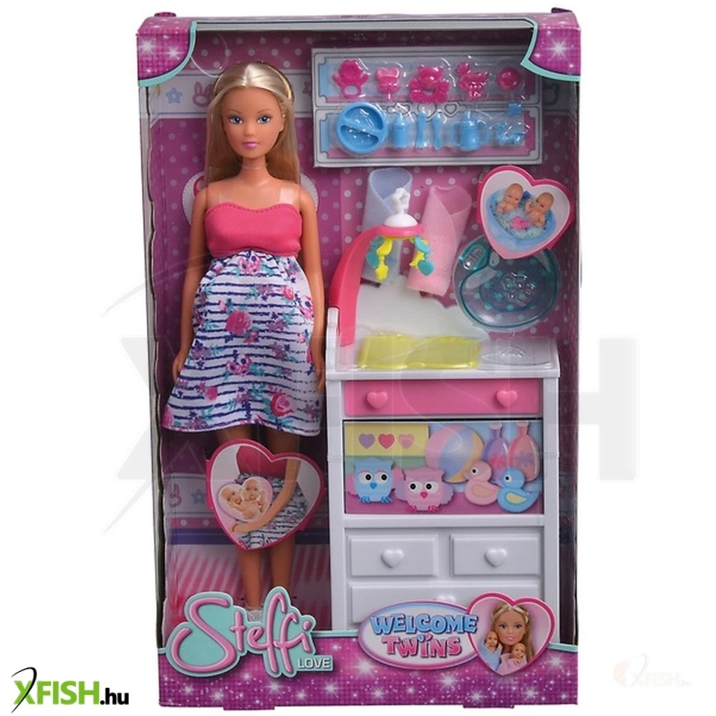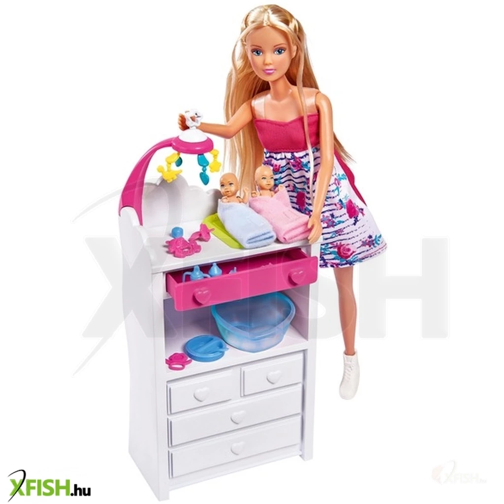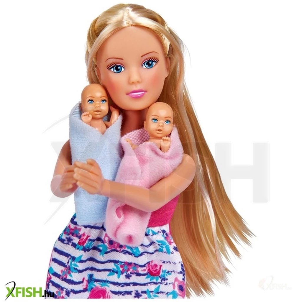 Gondozd Steffi baba újszülött iker babáit! A Steffi Love baba ikrekkel készletben Steffit és a két kisbabáját találod, akik nemrég jöttek a világra. A babákat meg tudod etetni, pelenkát cserélhetsz rajtuk, és még fürdetni is lehet őket. A babák pihenéséről a kiságyforgó gondoskodik, Steffi karjai és lábai mozgathatók, a baba hosszú tincseit ki tudod fésülni. A Steffi Love baba ikrekkel játékbaba mérete: 29 cm.
