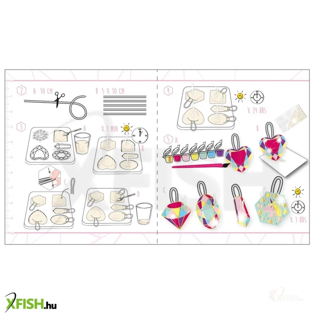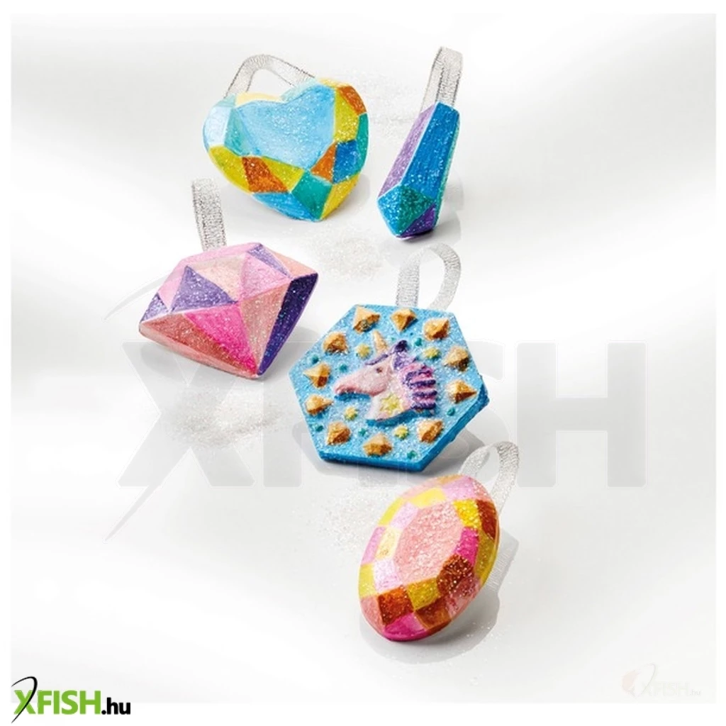 Készíts meseszép függődíszeket és színezd őket kedved szerint! Ennek a szuper kreatív fejlesztő játéknak a segítségével gipszet önthetsz, formázhatsz és díszíthetsz! A függődíszeket te magad fogod elkészíteni gipszből, melyhez pontos instrukciókat találsz a leírásban. A gipszport megfelelő mennyiségű vízzel összekeverve és a formákba öntve elkészítheted az alap díszt, de vigyázz! Ne felejtsd el belehelyezni a függőket, mielőtt teljesen megszilárdulnak!