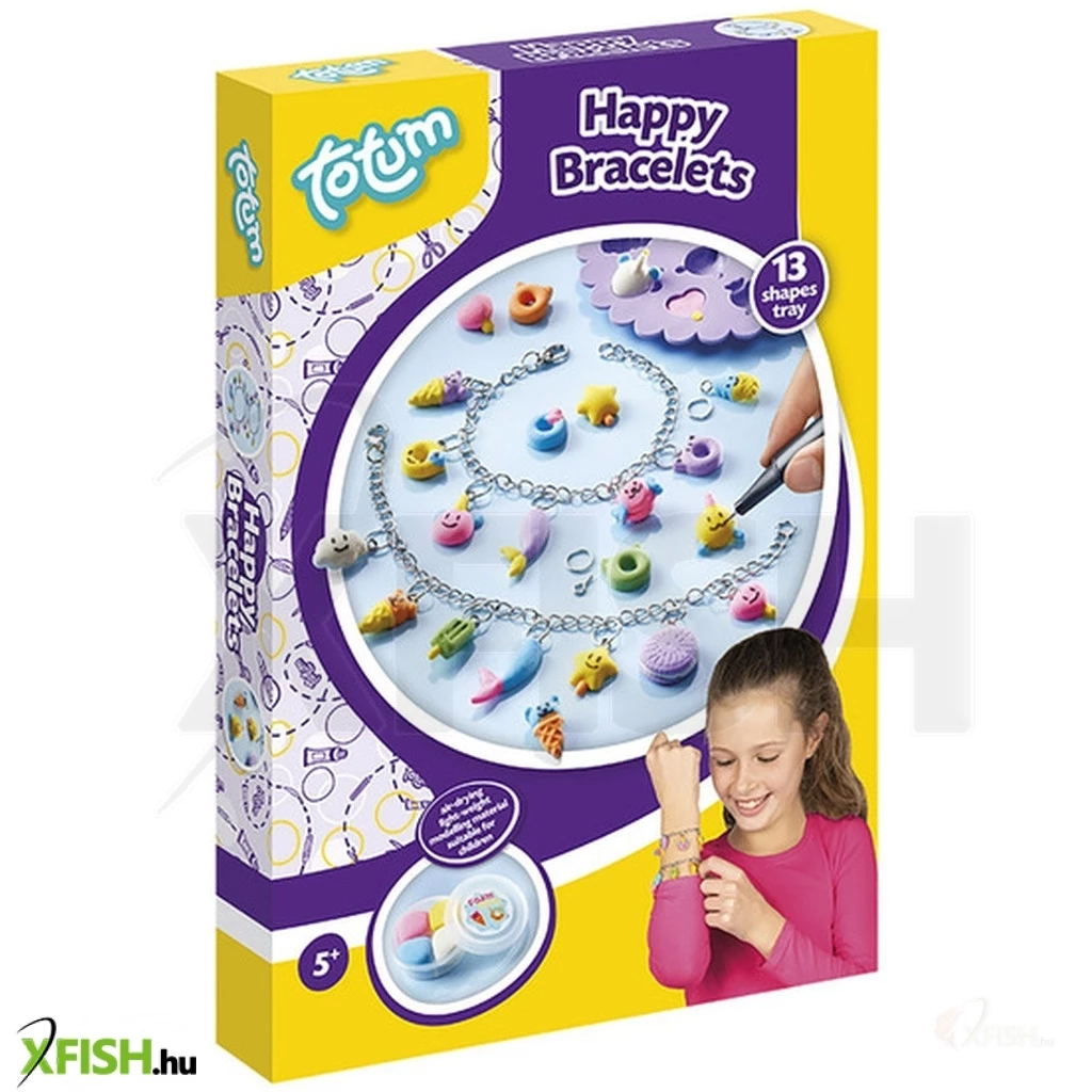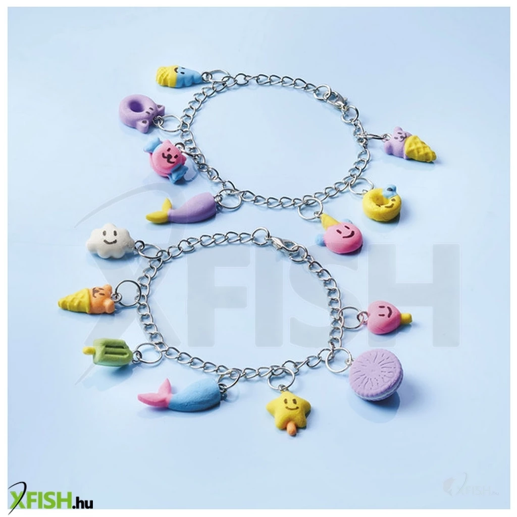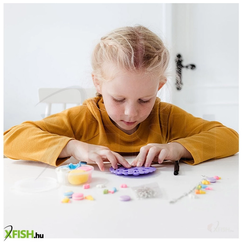 Kézműves készlet saját karkötők készítéséhez. Készítse el saját vidám medáljait agyagformákból, és díszítse a mellékelt tollal. 5 éves kortól alkalmas.