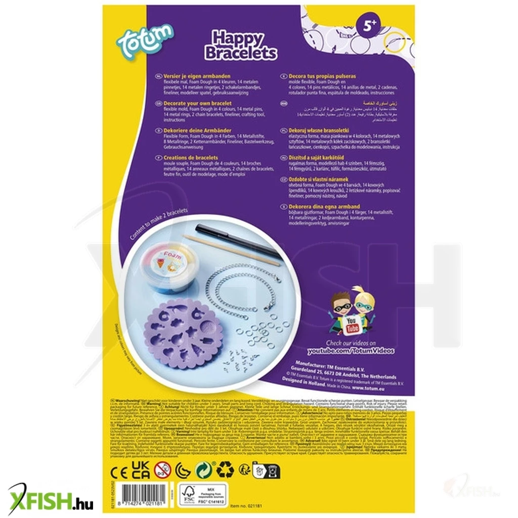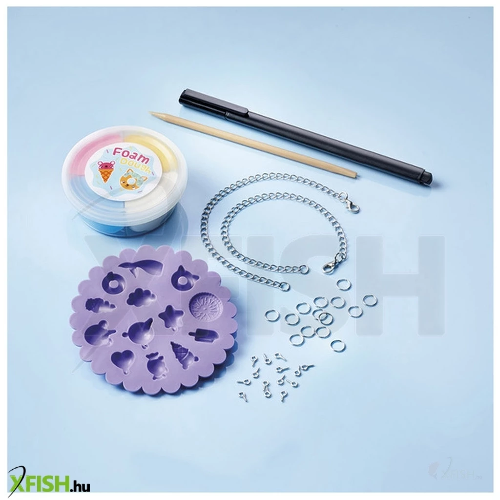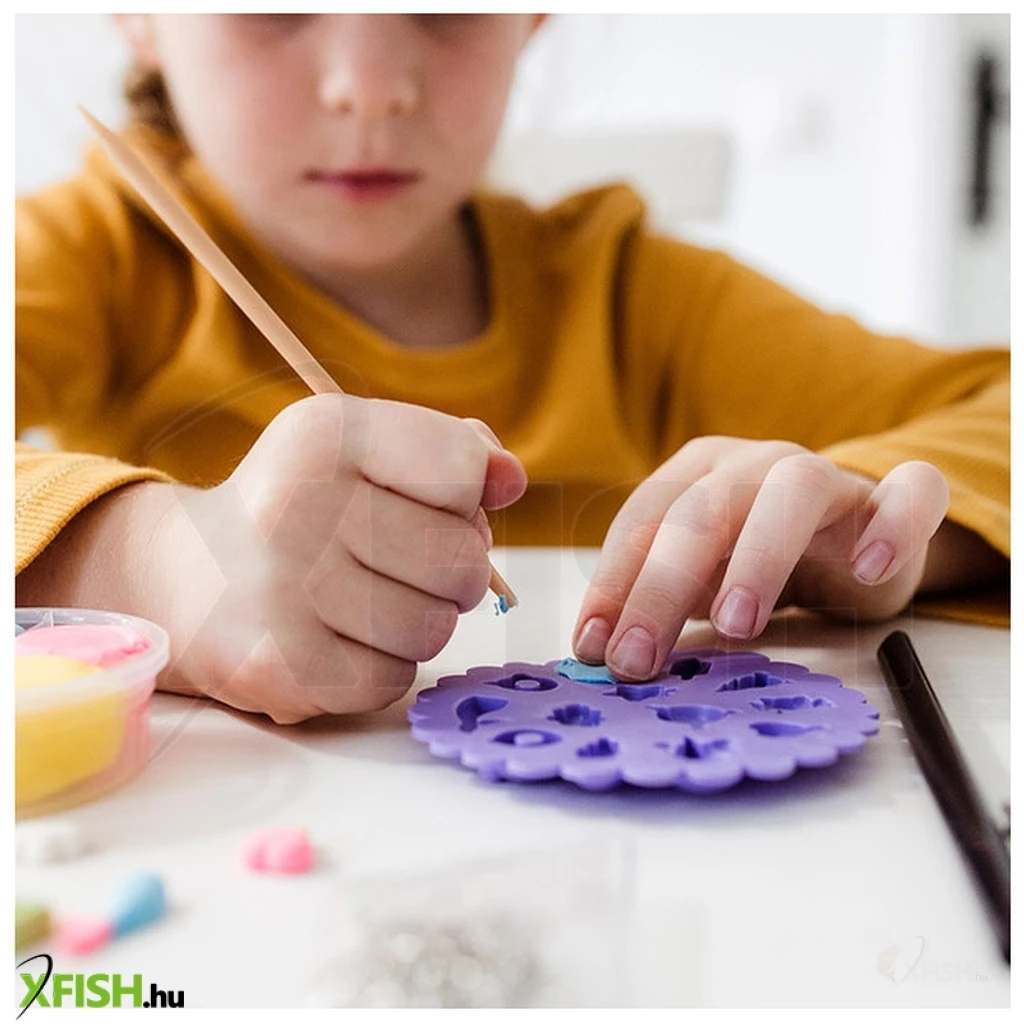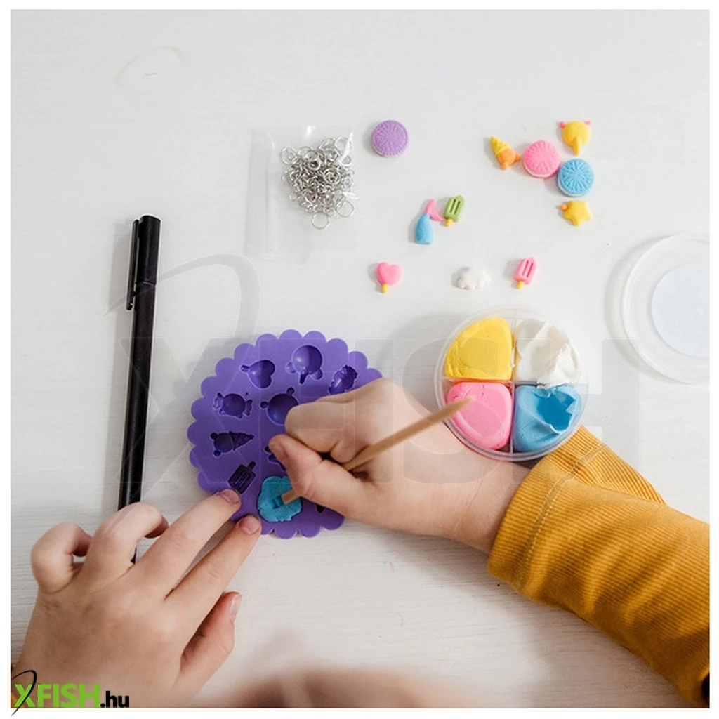 Kézműves készlet saját karkötők készítéséhez. Készítse el saját vidám medáljait agyagformákból, és díszítse a mellékelt tollal. 5 éves kortól alkalmas.