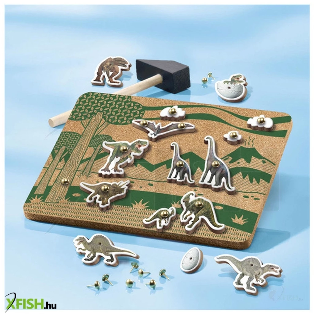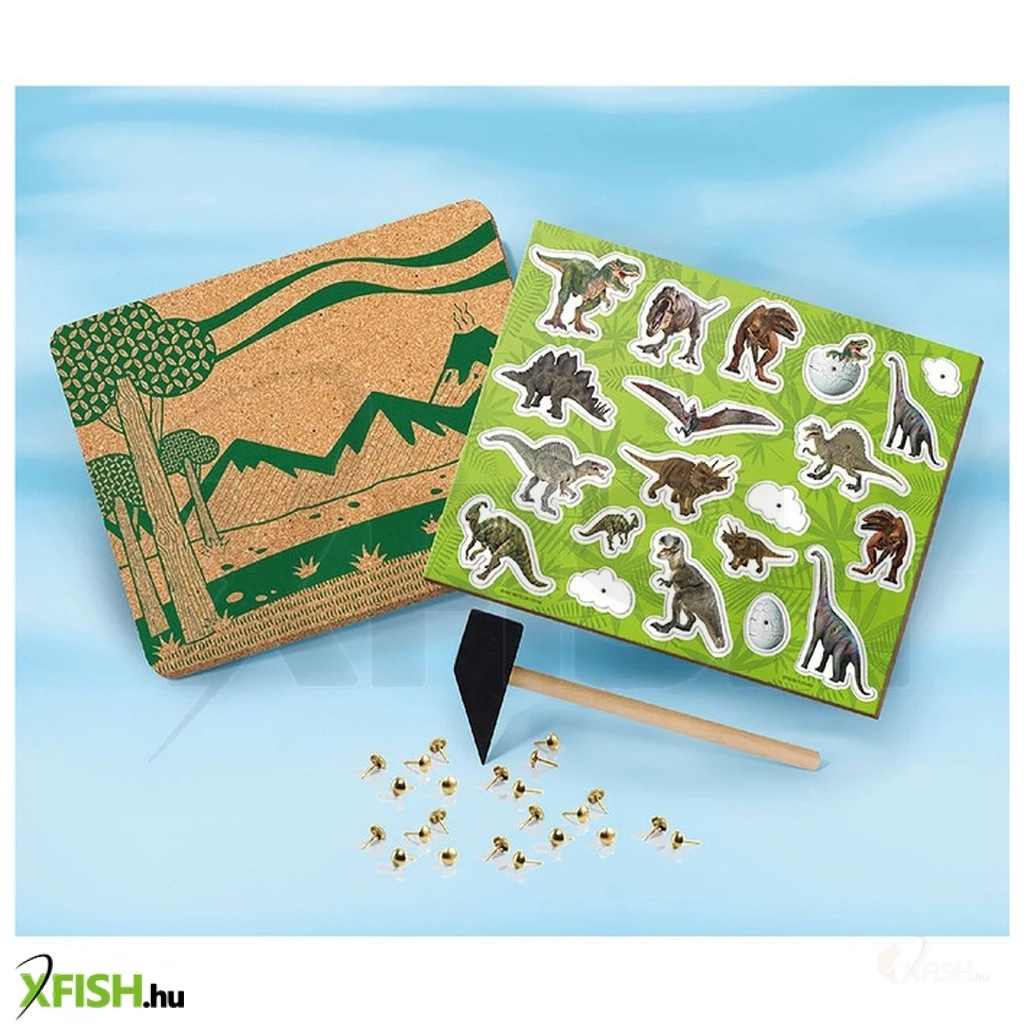 A kalapácsjáték tartalma: kétoldalú parafatábla, kalapács, rajzszegek, dínó figurák.