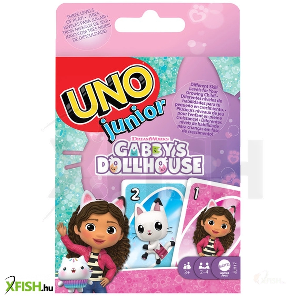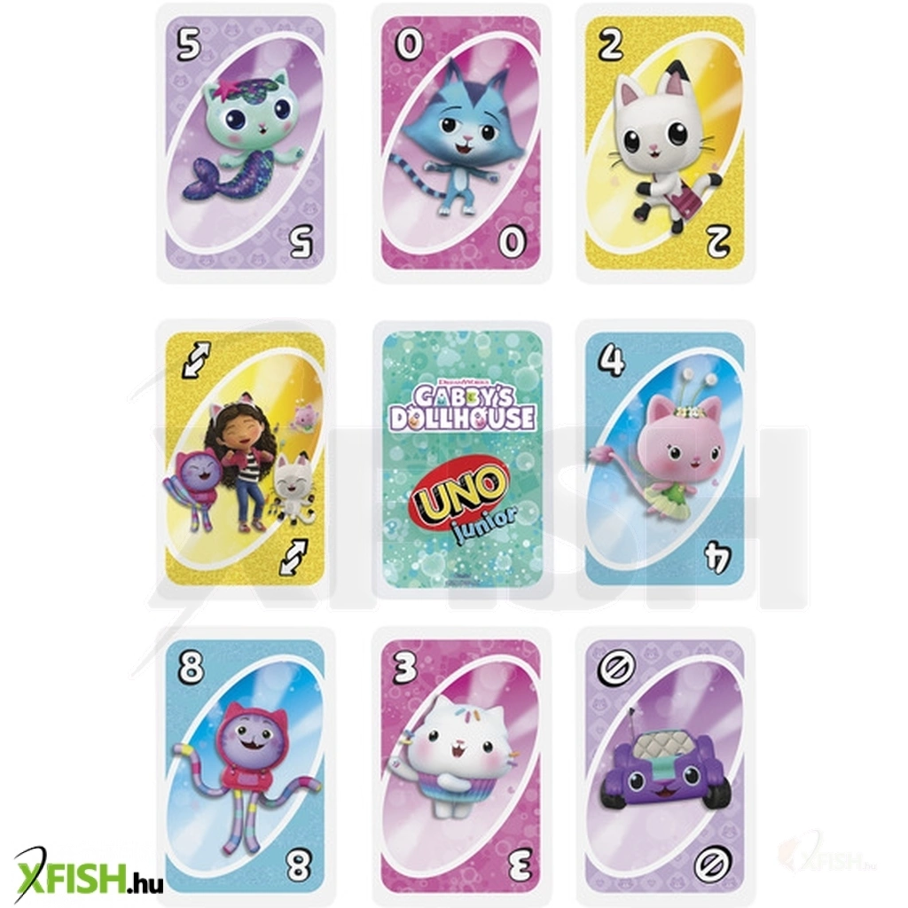A UNO Junior – Gabi babaháza kártyajáték a klasszikus UNO játék gyerekeknek készült, egyszerűsített változata, amely a népszerű Gabby’s Dollhouse mese karaktereivel készült. A kártyákon Gabi, Pandi Mancs és a sorozat többi kedvelt szereplője jelenik meg, így a játék még szórakoztatóbb a rajongók számára. A játék célja, hogy a játékosok a színek vagy számok egyeztetésével minél gyorsabban megszabaduljanak a kezükben lévő kártyáktól, miközben különböző akciókártyák is megnehezítik az ellenfelek dolgát.