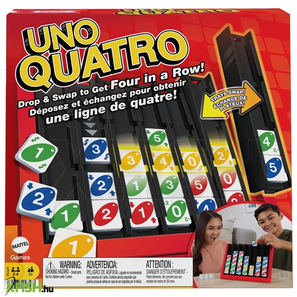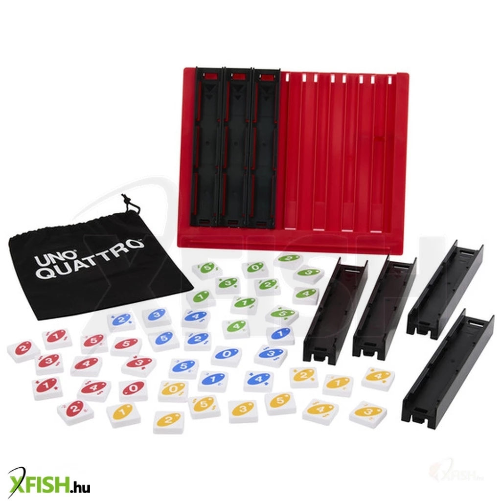 Minden játékos a kezében lévő 3 korongból játszhat ki egyet. A kis korongokat úgy kell a 7 oszlopban elhelyezni, hogy illeszkedjenek szín vagy szám szerint legalább egy szomszédos koronggal, mint az Uno kártyajátékban. A cél, hogy a színek vagy számok 4 egymás melletti egységet alkossanak sorban, oszlopban vagy átlósan, mint az amőba játékban. De az igazi izgalmakat a különleges akciókorongok jelentik, hiszen ezekkel oszlopok cserélhetők, eltolhatók a korongok lefelé vagy két korong is visszatehető. Vigyázat, nehéz lesz abbahagyni! Az Uno-t mindenki ismeri, így nem kell sokat magyarázni majd a színre szín, számra szám alapszabályt. Ez a 2-től 4 főig játszható társasjáték gyakorlatilag az Uno és az amőba szerelemgyereke, de persze van benne azért pár csavar is, hogy élvezetesebb legyen, mint a hagyományos ötödölő. A szabály egyszerű, össze kell gyűjtenünk a közös játéktéren négy azonos színű lapkát, vagy négy különböző színű, de ugyanolyan számmal ellátott lapkát. Aki hamarabb rakja le a negyedik, győzelmet jelentő lapkát, az a nyertes. Ez így egyszerűnek tűnik, de sokszor kell mérlegelnünk, hogy nekünk legyen jó vagy inkább a másikat – és ezzel magunkat is - hátráltassuk. A tapasztalat az, hogy érdemes kiszúrni a másikkal, úgy talán jobbak az esélyek. Nehezítő tényező, hogy nem látjuk a többi játékos lapkáit, viszont egy ügyesen időzített -2 lapka lehelyezésével máris megfoszthatjuk az ellenfeleinket tőlük. Érdekes csavar még az oszlop áthelyezése lépés is, amivel gyakorlatilag az egész játékteret átrendezhetjük. Az Uno Quatro hozza a klasszikus Uno életérzést, amibe egyaránt keveredik izgalom és a káröröm, mégis egy új megközelítésben rakosgathatjuk a lapkákat.