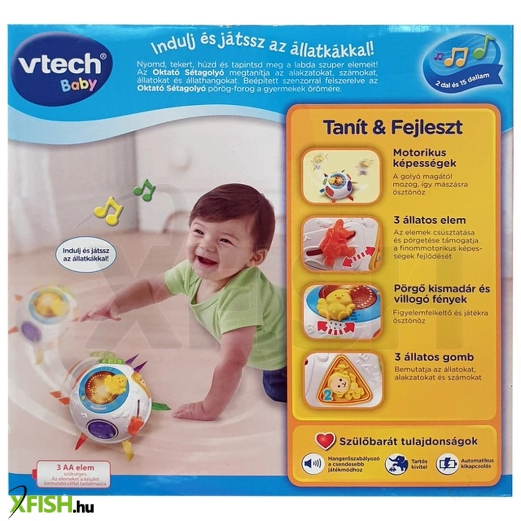 Kergesd a színes golyót, vidám dallamok kíséretében! A V-Tech beszélő sétagolyó bébijáték egy ügyességi és fejlesztő állatos golyó, ami állandóan izeg-mozog. A golyó kellemes zenéket játszik, és közben megtanítja a gyerekeknek az állatokat, a számokat, és a különböző formákat is. A golyó magától fog ide-oda gurulni, a gyerekek kacagva fogják követni, másznak majd utána, miközben hangosan kacagnak! A játék fejleszti a mozgékonyságot, a motoros készségeket is. A játék 3 darab AA ceruzaelemmel működik, a csomagolás az elemeket tartalmazza. A V-Tech beszélő sétagolyó bébijáték átmérője: 15 cm.