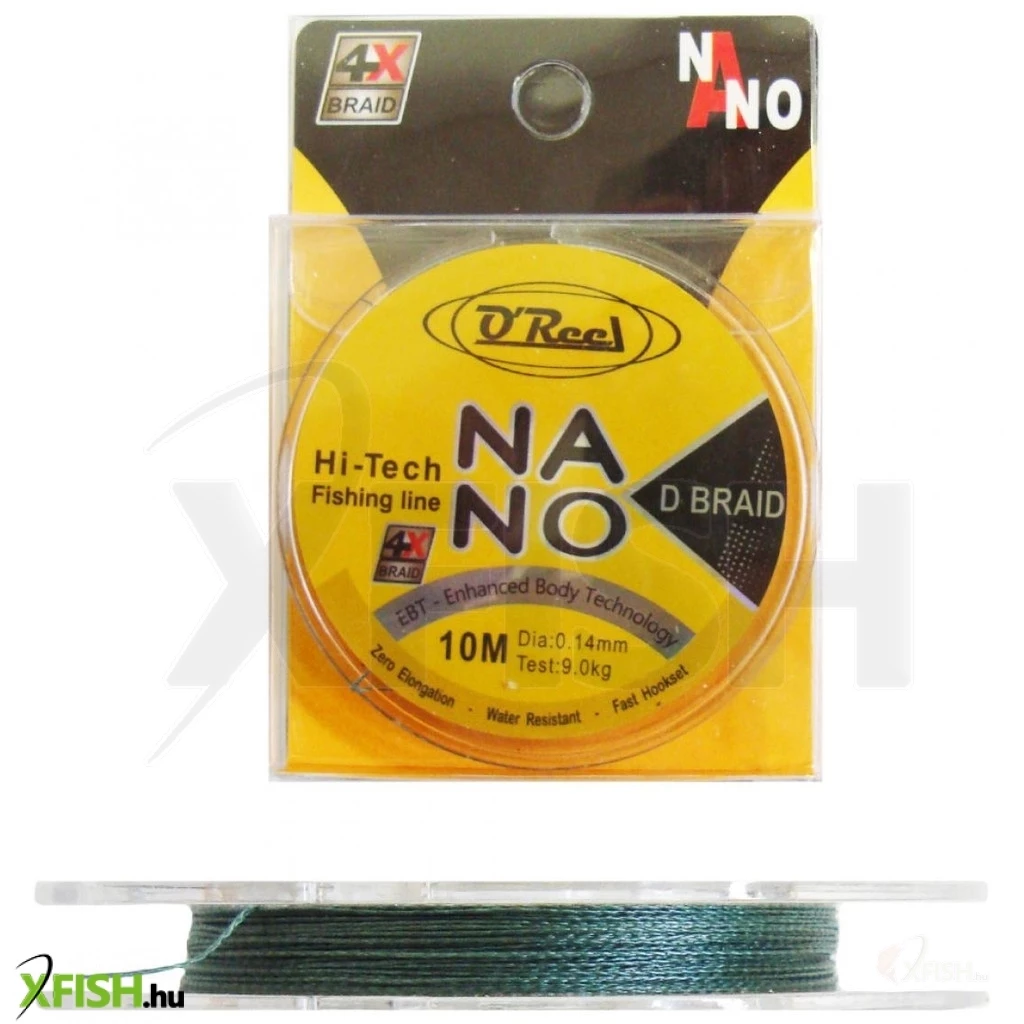 Az OREEL NANO D-BRAID 4x fonott zsinór 4db PE mikrószálból van összefonva. A finom, vékony, erős mono szálaknak köszönhetően sokkal nagyobb a teherbíró képessége a zsinórnak. A fonott zsinór nem nyúlik, ezért minden apró rezzenést továbbít botunk felé ezért azonnal reagálhatunk a kapásra. A D-BRAID fonott zsinor felületén egy vékony bevonatot kapott, ezért sokkal ellenállóbb és kopásállóbb a zsinór. A a bevonat másik előnye még az is, hogy a nedvszívó képessége minimális. Többféle méretben és 2 kiszerelésben kapható(10m, 100m). A 10m kiszerelést egyre többen választják, mert tökéletes dobó előke készítéséhez, vagy előkék kötésére, és így nem kell túl nagy mennyiséget vásárolni. Ez a 10m-es kiszerelés sok előke megkötéséhez elegendő. Az előke használata ideális olyan vizeken, ahol nem hagyhatjuk a halat kontrol nélkül, ahol számít az azonnali bevágás. De a vékonyabb átmérőket hajszál előke kötésére is használhatjuk.