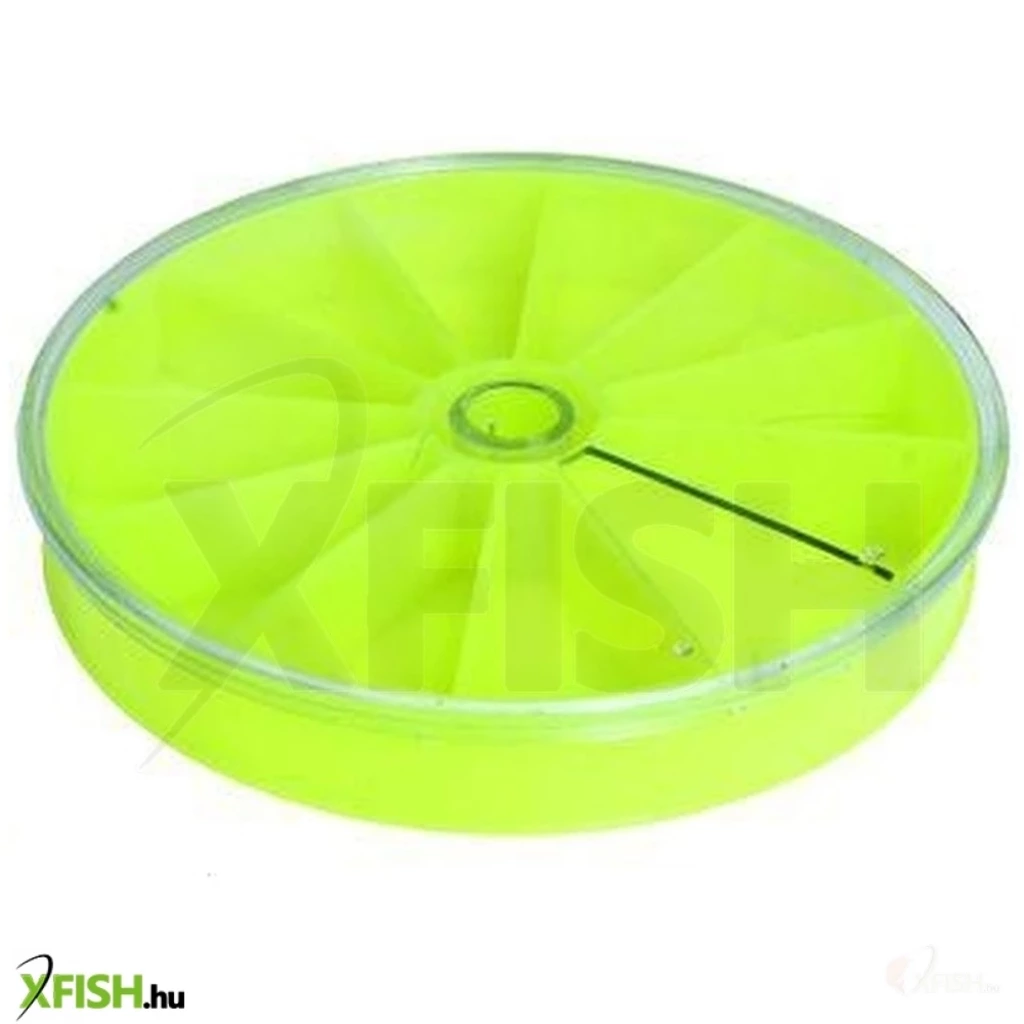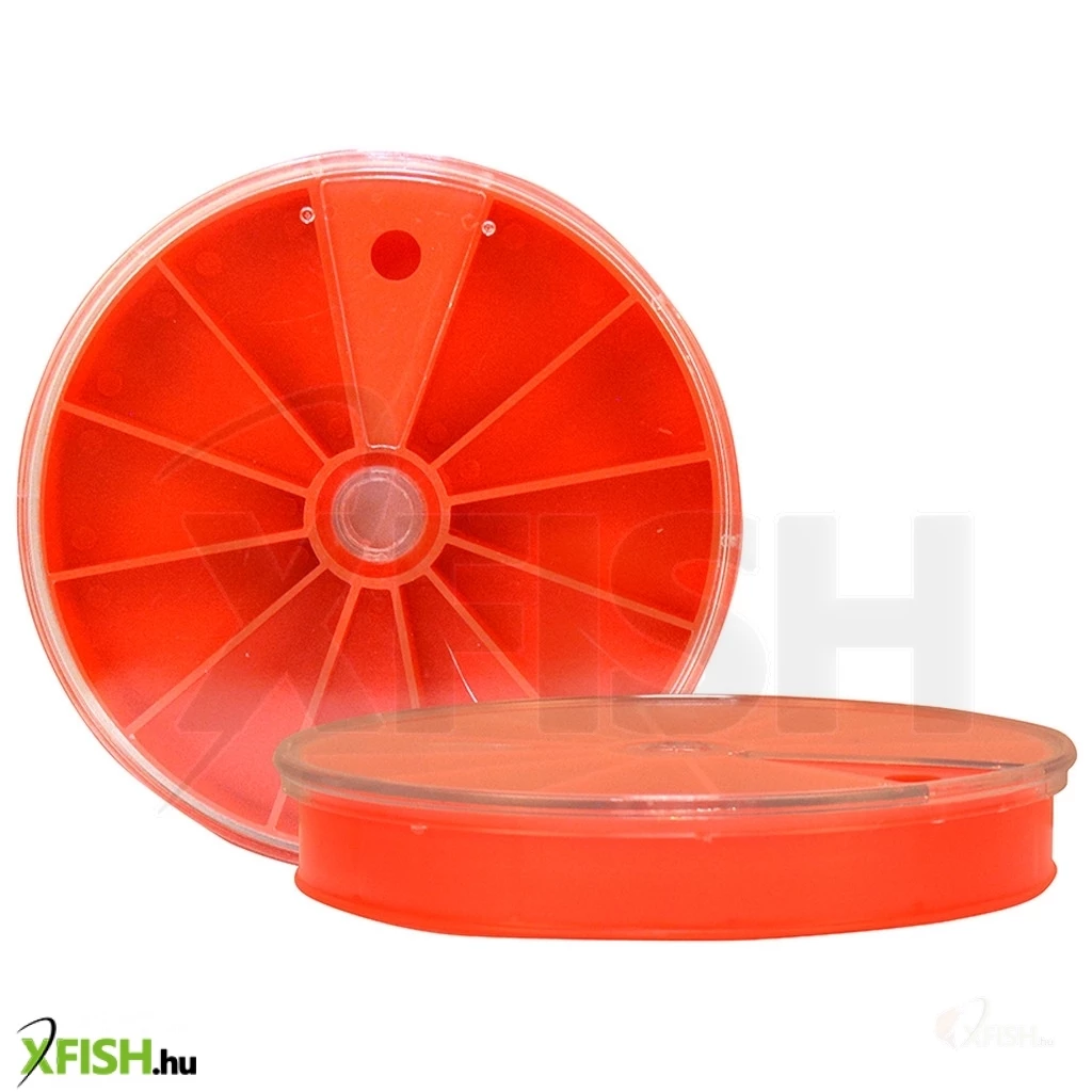 Nagyméretű, kör alakú horgos doboz, 11 fakkal, forgatható tetővel. A tetőn lévő ablak mérete pontosan igazodik a fakkok szélességéhez, így a tároló rekeszekből nem szóródhatnak ki, és nem keveredhetnek össze a horgok. A doboz átmérője 14 cm, magassága 2 cm.