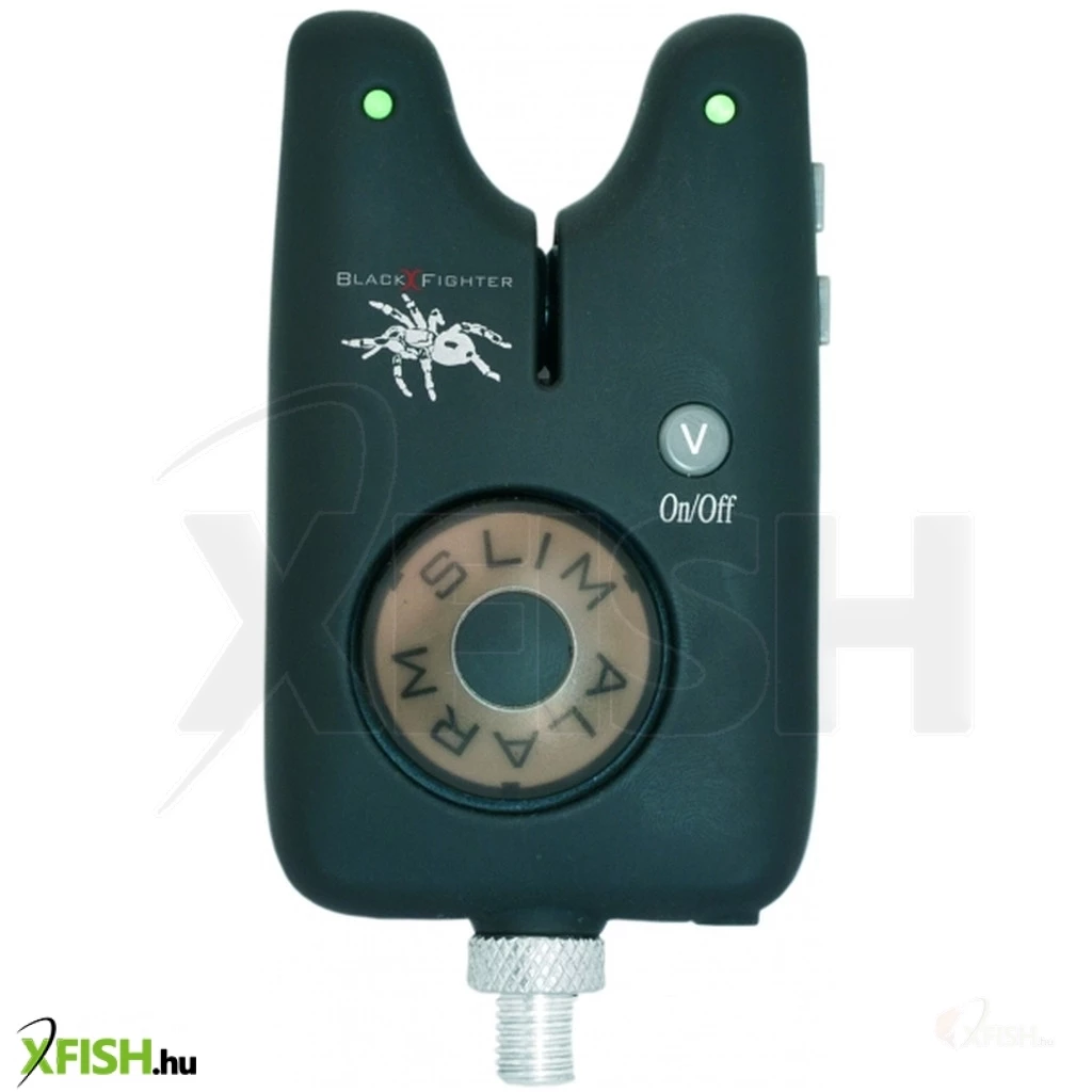 A Black Fighter termékcsalád népszerűsége és termékpalettája folyamatosan növekszik. A Black Fighter Slim elektromos kapásjelző a márkára jellemző extravagáns megjelenésen túl mindent tud, ami egy korszerű elektromos kapásjelzőtől elvárható. A kapásjelző úgynevezett "Soft Touch" bevonatot kapott, mely kellemes tapintás biztosít, és ami még fontosabb, védi a kapásjelzőt a külső hatásoktól, párától. Az előlapon található elegáns kör alakú felület kapás esetén feltünő fénnyel villog. Érzékelő tárcsája és energiatakarékos elektronikája a legapróbb, maszatolós kapások észlelésére is alkalmas. Természetesen hullámverés, szél esetén a kapásjelző érzékenységének állításával elkerülhetjük a kedvezőtlen környezeti hatásokból származó fals riasztásokat.Használata:Első használatkor, ha az elemek behelyezése után nem kapcsolódik be automatikusan a készülék, a "V" jelzésű bekapcsoló gombot kell néhány másodpercig nyomva tartani. Fontos, hogy ugyanez a gomb egyben a hangerőt is állítja, így további rövid nyomásokra a hangerőt tudjuk léptetni. Hosszú megnyomásra kapcsolja ki a készüléket. Az elektromos kapásjelző oldalán két nyomógomb található "S" és "T" felirattal. Az "S" a "sensitivity" azaz érzékenység beállítására használható. A gombot nyomva 8 féle szint állítható be. Az egyes szintek beállítását változó hosszúságú dallam is jelzi, hogy tudjuk hol tartunk. A legrövidebb hangjelzés állítja be a legmagasabb érzékenységi fokozatot. Ekkor a kapásjelző görgő minimális elmozdulására is azonnal jelzést kapunk. További nyomkodásra a dallamok hosszának növekedése azt jelzi, hogy egyre nagyobb görgő elmozdulás esetén kapunk csak kapásjelzést. A nyolcadik szinten már futni kell a zsinórnak, hogy bejelezzen. A fölső "T" jelzésű gomb a kapásjelző hangjának tónusát adjusztálja. Itt is 8 féle lehetőség közül választhatunk, nyilván egyéni igény kérdése, kinek melyik tetszik. A kapásjelző alján a szokásos masszív, szabvány menet található, és egy kis jack bemenet a szvingernek. A menet tetején, a jelzőhöz közel egy csavar is rendelkezésünkre áll, hogy a kapásjelzőt megfelelően magunk felé (vagy a kívánalmaknak megfelelően) rögzíthessük be.Energiaellátás:Az elemek helyes behelyezésére ügyelni kell! 3 db kis ceruzaelemre lesz szükségünk (AAA), mely nincs mellékelve, a gyártó a felhasználóra bízza, milyen minőségűt szeretne beletenni. A hátlap lecsúsztatása után a két szélső elem pozitív pólusa lesz lefelé, a középsőé felfelé.