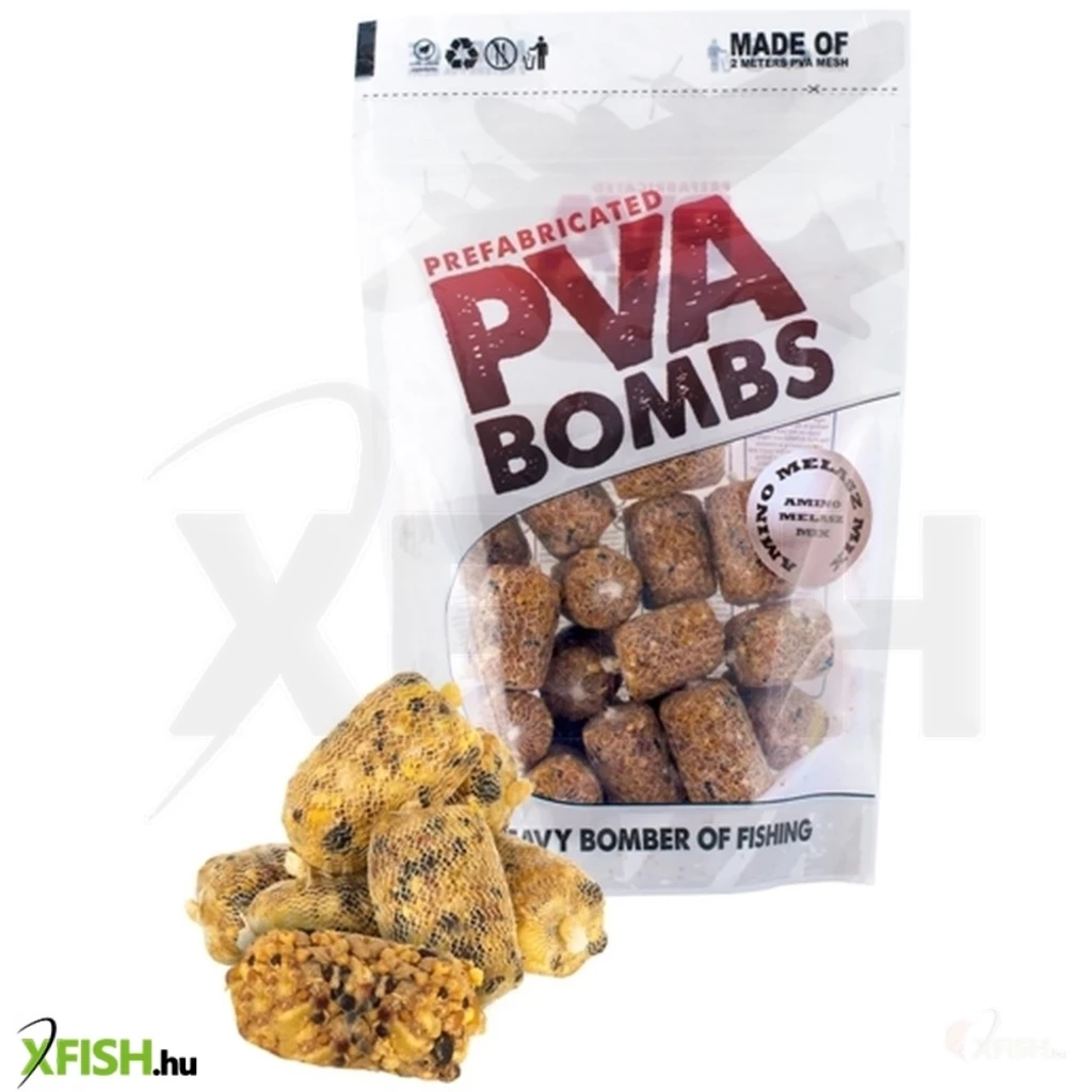 Minden egyes zsákocska mögött hosszú évek versenytapasztalata, több ezer vízparton töltött óra van. A PVA BOMBS a speciális helyzetekhez is igazodva 5 különféle ízben kerül forgalomba, így minden szituációban eredményesen használható, melyek íz és beltartalmuktól függetlenül PVA barát dippel vagy locsolóval még vonzóbbá tehetők. Minden termék a haltakarmányozásban is használt magas minőségű kiváló beltartalommal bíró haltáp-keveréket és hozzáadott aminosavakat, omega-3 zsírsavakban gazdag halolajat és a tápanyag hasznosítást segítő esszenciális olajokat tartalmaz.