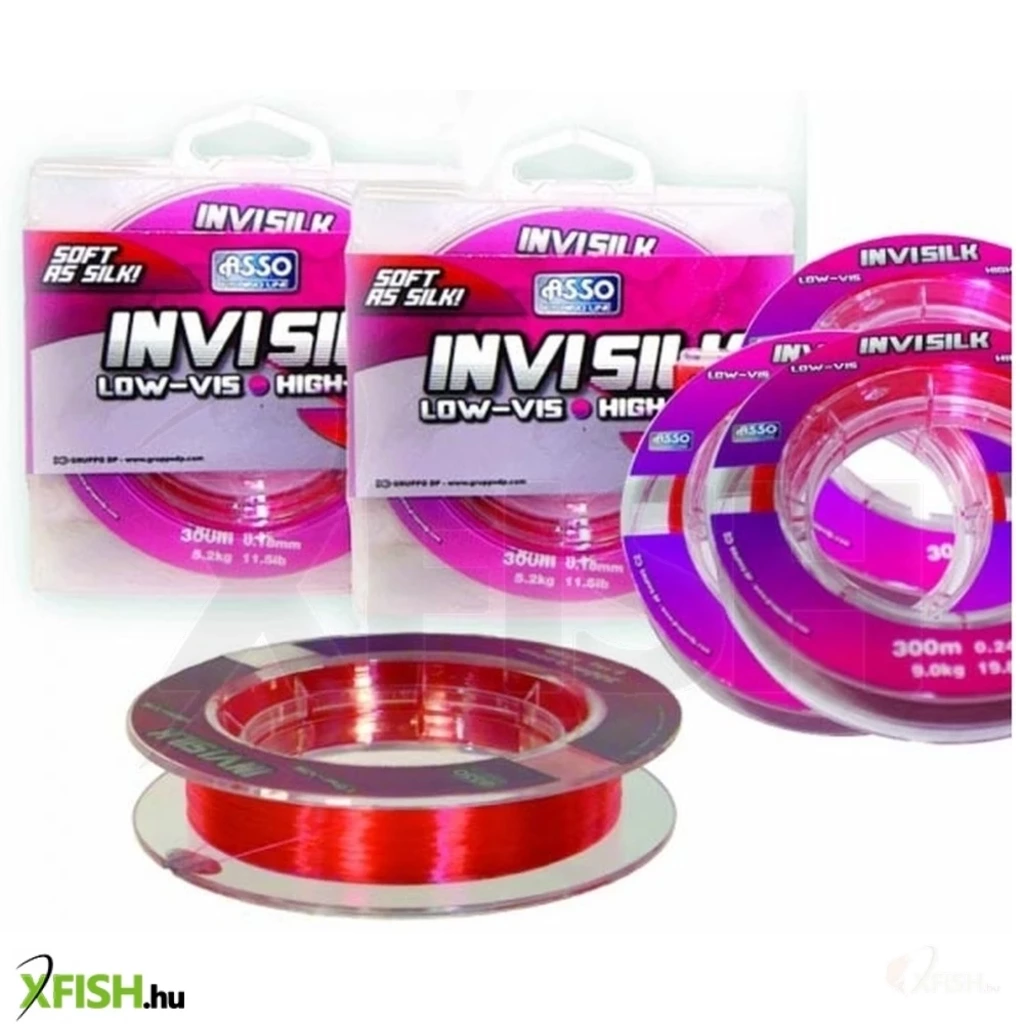 ASSO INVISILK 300m távdobó zsinór. Az INVISILK sorozat megjelenése után alig egy hónap alatt lett rendkívül népszerű és keresett zsinór. Az oka egyszerű és nem az olcsóságában keresendő, mert ez a zsinór nem az árával fog hódítani, igaz az ár érték aránya a nyújtott szolgáltatások mellett kiváló. A leírt és megadott adatokat tökéletesen produkálja, 100%-ig megbízható, ezért azt kapjuk a pénzünkért amit a gyártó tesztjei alapján mond és vállal. Akár azt is mondhatjuk, hogy fajlagosan olcsó zsinór, mert nem kapunk a parton idegösszeomlást mint amikor a "jó" minőségűnek titulált zsinórunk már 3. alkalommal szakad be. Az ASSO INVISILK egy igazán kiváló minőségű pontyozó és feeder horgászathoz tervezett, távdobó zsinór. Kontrollált alacsony nyúlású , mely gyors bevágásokat tesz lehetővé, hogy ne szalasszuk el a kapásokat. Speciális szilikon tartalmú UV védelmet is nyújtó bevonata kopásállóvá és hosszú élettartamúvá teszi, miközben távdobáskor is jó szolgálatot tesz, mert könnyen fut a gyűrűk és zsinórvezető- görgő között, miközben alig melegszik fel. A zsinóroknak két nagy ellensége van a nap UV sugarai és a nagy hőhatás. Az UV roncsolja a zsinór szerkezetét molekuláris szinten átrendezve azt, ezért lesz kemény és töredezett. A hő miatt pl. dobáskor keletkezett nagy hő esetén a zsinór nyúlik és keményedik ami szintén nagy szakító szilárdságbeli veszteséget jelent. Ráadásul ha nincs a zsinórnak védelme dobáskor nagy súrlódó hő keletkezik melyet tovább ront, hogy a zsinór amint a vízbe-hez ér nagyon hirtelen visszahűl(hősokk), ami szó szerint megadja neki a végső döfést. Általában ezek után a zsinór kemény lesz, könnyebben sodródik és szakad. Az INVISILK speciális bevonata már a gyártás alatt és nem csak a gyártás utáni pihentető szakaszban kerül a zsinórra, ezért a bevonat így vastagabb és tartósabb. A zsinór bevonata és speciális pink színe miatt a vízben láthatatlan, míg a parton éppen ellenkezőleg viselkedik és jó láthatóságával segít a szerelék előkészítésében.