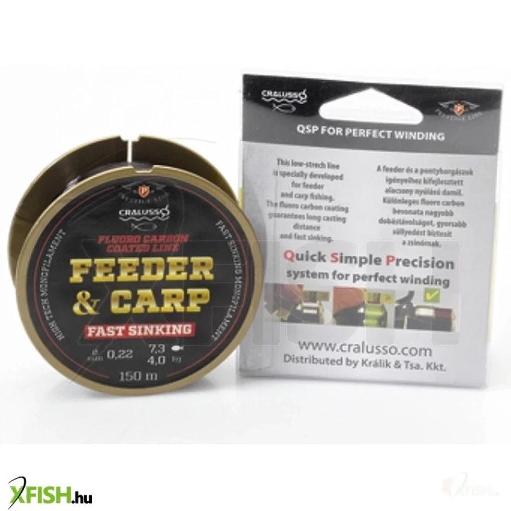 "A Cralusso prémium minőségű zsinór kínálata, feeder és pontyhorgászat igényeihez fejlesztett zsinórokkal bővült. A FEEDER & CARP fluorocarbon bevonattal lett ellátva, mely gyorsabb merülést, csökkent nyúlást és nagyobb kopásállóságot tesz lehetővé a hagyományos damilokhoz képest. A Cralusso méretpontos damiljainak, mint a FEEDER&CARP feltekercselését is segíti a saját fejlesztésű QSP kalkulátor, mely segítségével precízen, optimális mértékben tudjuk feltölteni orsónk dobjára a horgászzsinórt." (forrás:cralusso)