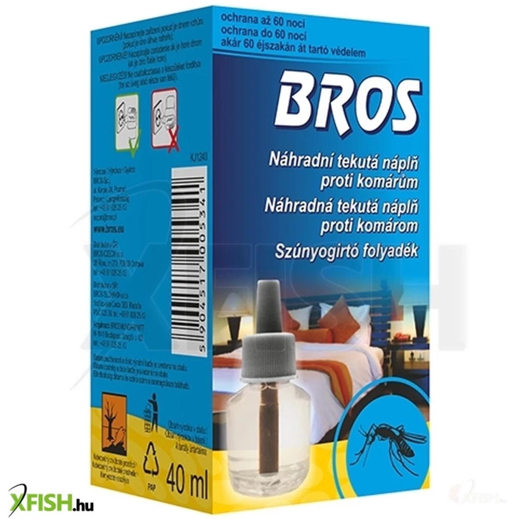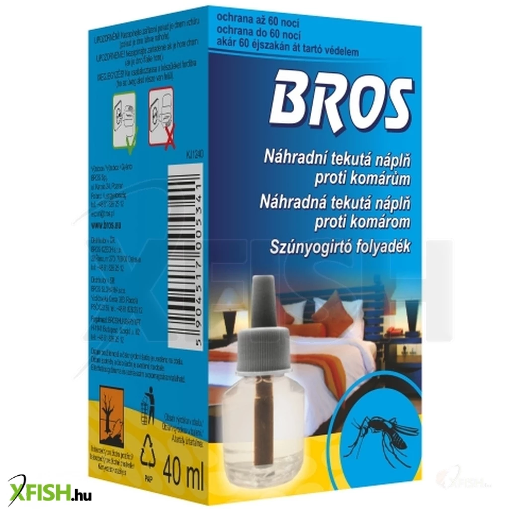 Utántöltő folyadék elektromos készülékhez. Használati utasítás:A folyadékot helyezze be alulról a készülékbe, majd dugja be a fali 220V-os hálózati csatlakozóba. A folyadék párolgása egész éjszaka védelmet biztosít a szúnyogok ellen. A készüléket használat után húzza ki a fali csatlakozóból.Figyelem:Gyermekek, betegek, vagy érzékeny személyek mellett, használja inkább a BROS SENSITIVE szúnyogirtó készüléket.