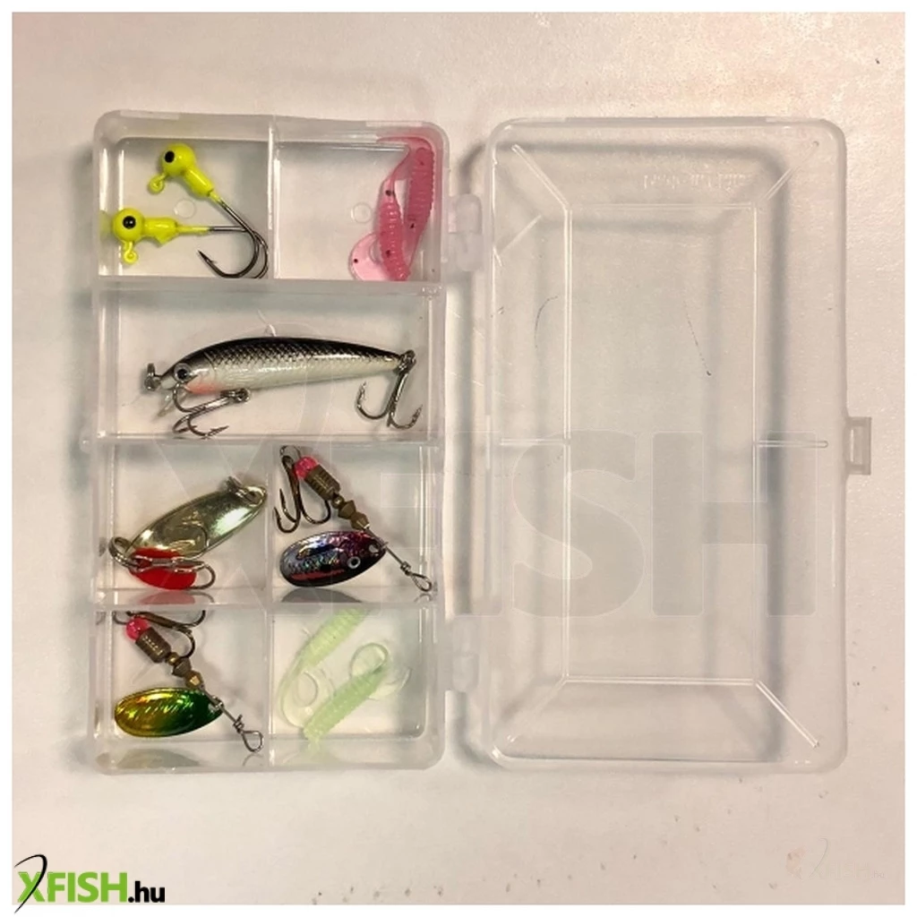 Továbbá a csomag egy praktikus, 7 fakkos műanyag rendszerező dobozt is tartalmaz, amely segít rendben tartani a különféle kiegészítőket. Az alaptartozékok között található 2 darab körforgó villantó, 1 darab támolygó villantó, 1 darab wobbler, 2 jigfej valamint 4 mikrotwister test, melyek széleskörű lehetőségeket kínálnak a különböző horgász módszerek és körülmények kihasználására.