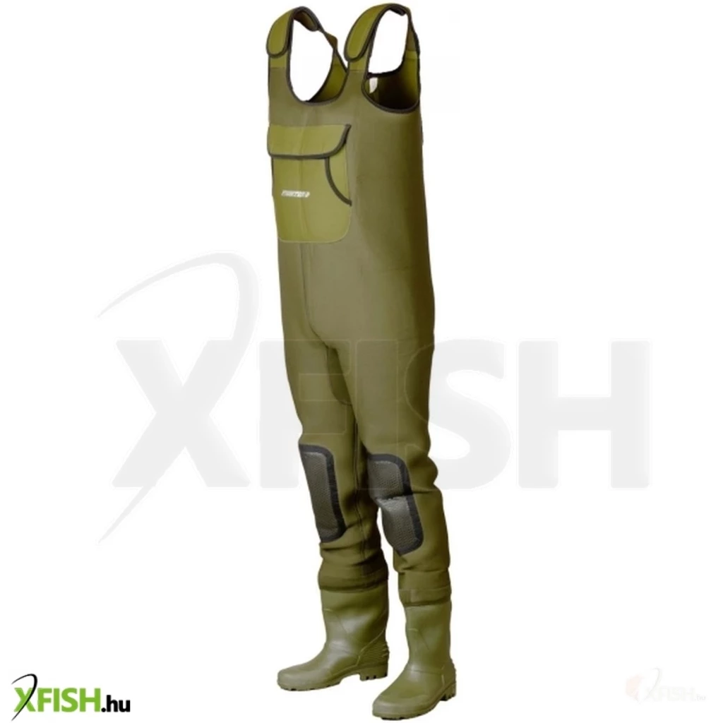 Kényelmes és és kiváló kinézetű, modern neoprén melles nadrág, teljesen neoprénbélésű csizmával és extra vastag rétegű térdvédőkkel a maximális védelem érdekében.