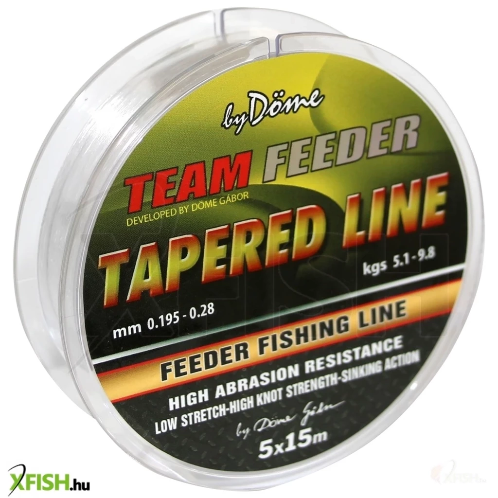 A By Döme TEAM FEEDER Tapered Leader dobóelőke zsinórok arra lettek kifejlesztve, hogy biztonságos és szabályos módon tudjunk velük minél távolabb horgászni! Manapság sok vízterület házirendjében kikötés a fonott fő-, vagy dobóelőtét zsinórok mellőzése, ez pedig egy feederbotos horgász számára jelentősen megnehezíti a távdobást. Nos, ezek a speciális vékonyodó (vagy épp vastagodó, nézőpont kérdése) dobóelőkék jelentik a legjobb megoldást számukra, a könnyű és hatékony távdobáshoz! Hogyan működik? A tekercsen 5 db 15 méter hosszú monofil dobóelőke van, amely fokozatosan vastagodik fel. A vékonyabb felét kell a főzsinórral összekötni, amely minimális csomót képez, gond nélkül tud kisurranni a gyűrűk között. A Tapered Leader zsinóroknál alkalmazott kiváló minőségű kopolimer alapanyag, kifejezetten alacsony nyúlású és könnyen köthető. Áttetsző színének köszönhetően a vízben csaknem láthatatlanná teszi ezt a vékonyodó zsinórt, miközben a TEAM FEEDER damilokra jellemző tökéletes süllyedő képességet és kopásállóságot is biztosítja!