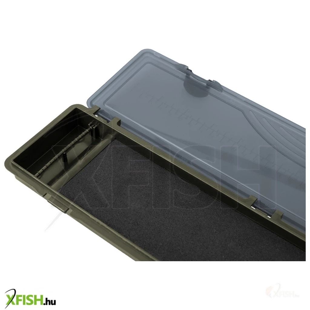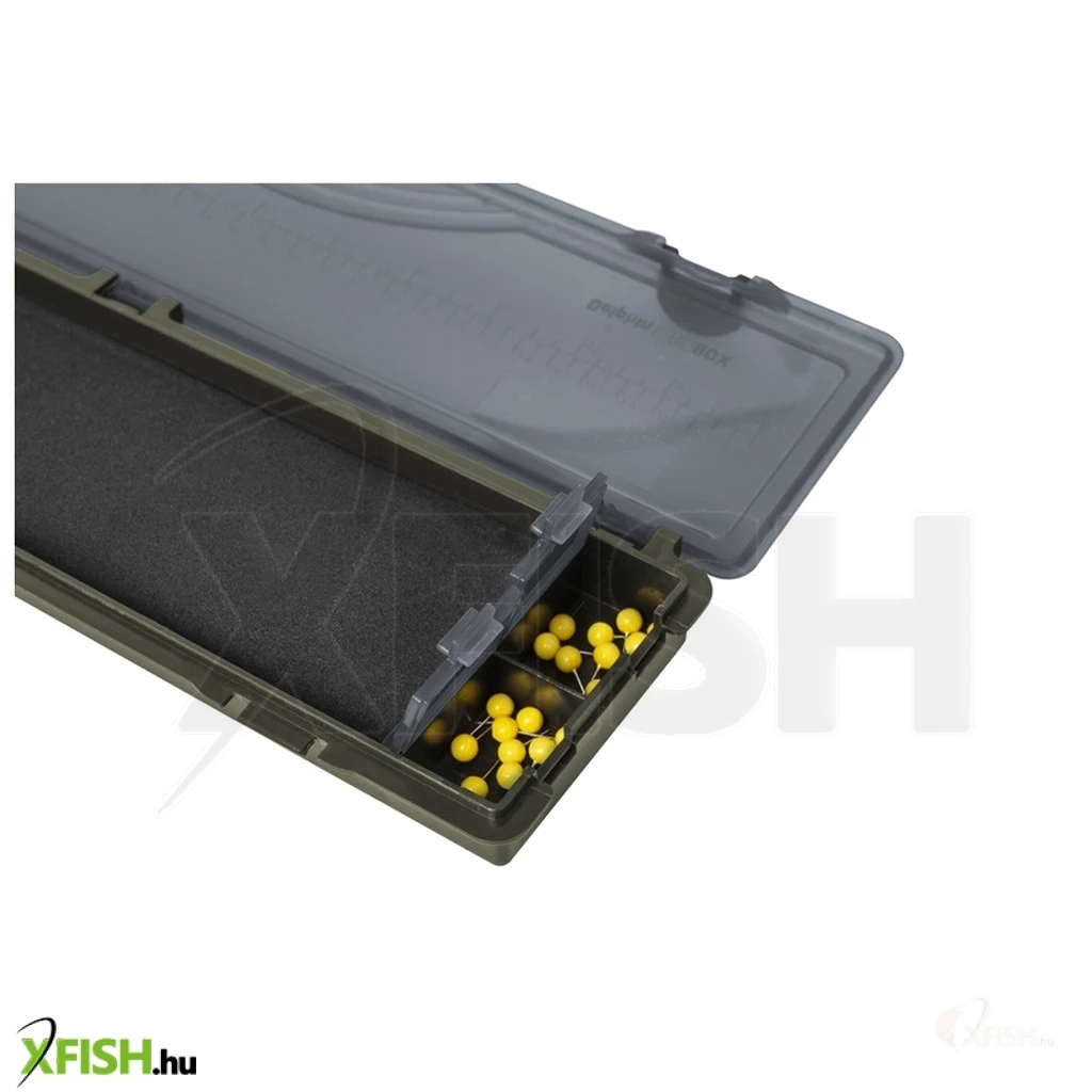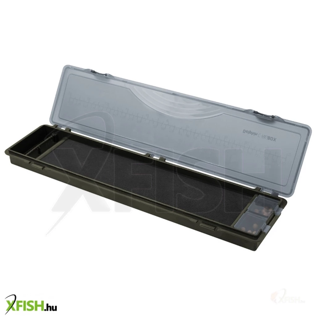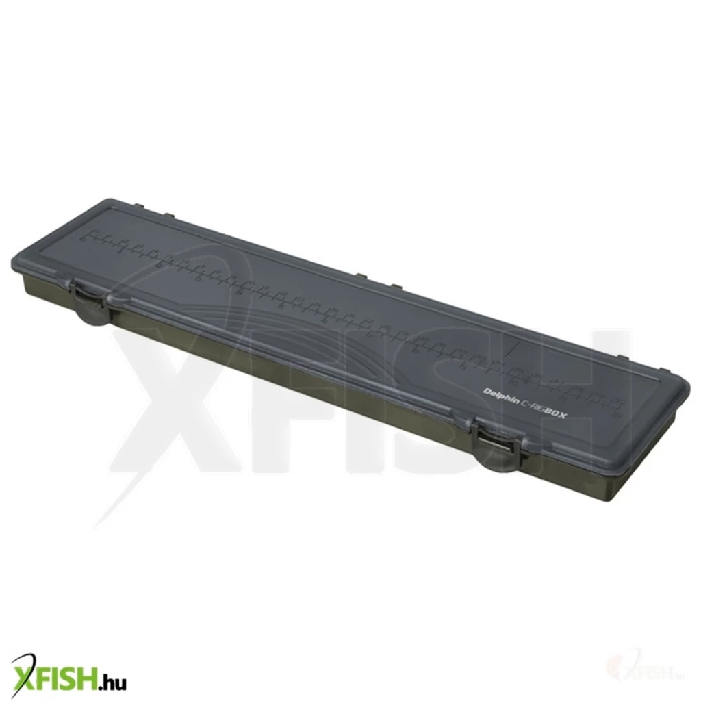 Nagyon praktikus Delphin C-RIGBOX kemény előketartó. Belsejében van egy műanyag bekattintós rész a horgok rögzítéséhez és egy habszivacs 260x69mm-es méretekkel, amelyekbe az előkék végét a hozzácsomagolt tűk segítségével lehet rögzíteni. A 20 darab sárga, kerek fejű tű két zárható rekeszben van. A sötétzöld színű előketartó szürke, átlátszó fedéllel van lezárva. A fedélen praktikus skála van centiméterben (30 cm) és hüvelykben (12 "). Megfizethető és nagyon praktikus berendezés nem csak ponty horgászok számára.