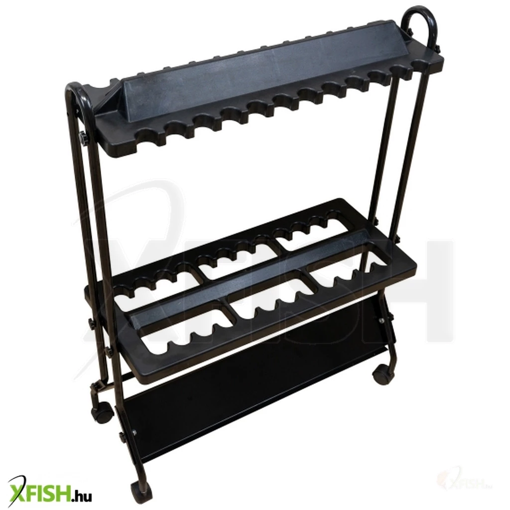 Jelen termék egy kompakt elemekből álló, könnyedén összecsavarozható állvány, mely műanyag és fém elemekből áll, időtálló darab.Horgászboltosok és magánszemélyek részére is kiváló alternatívát nyújt akár 24 darab bot tárolására.