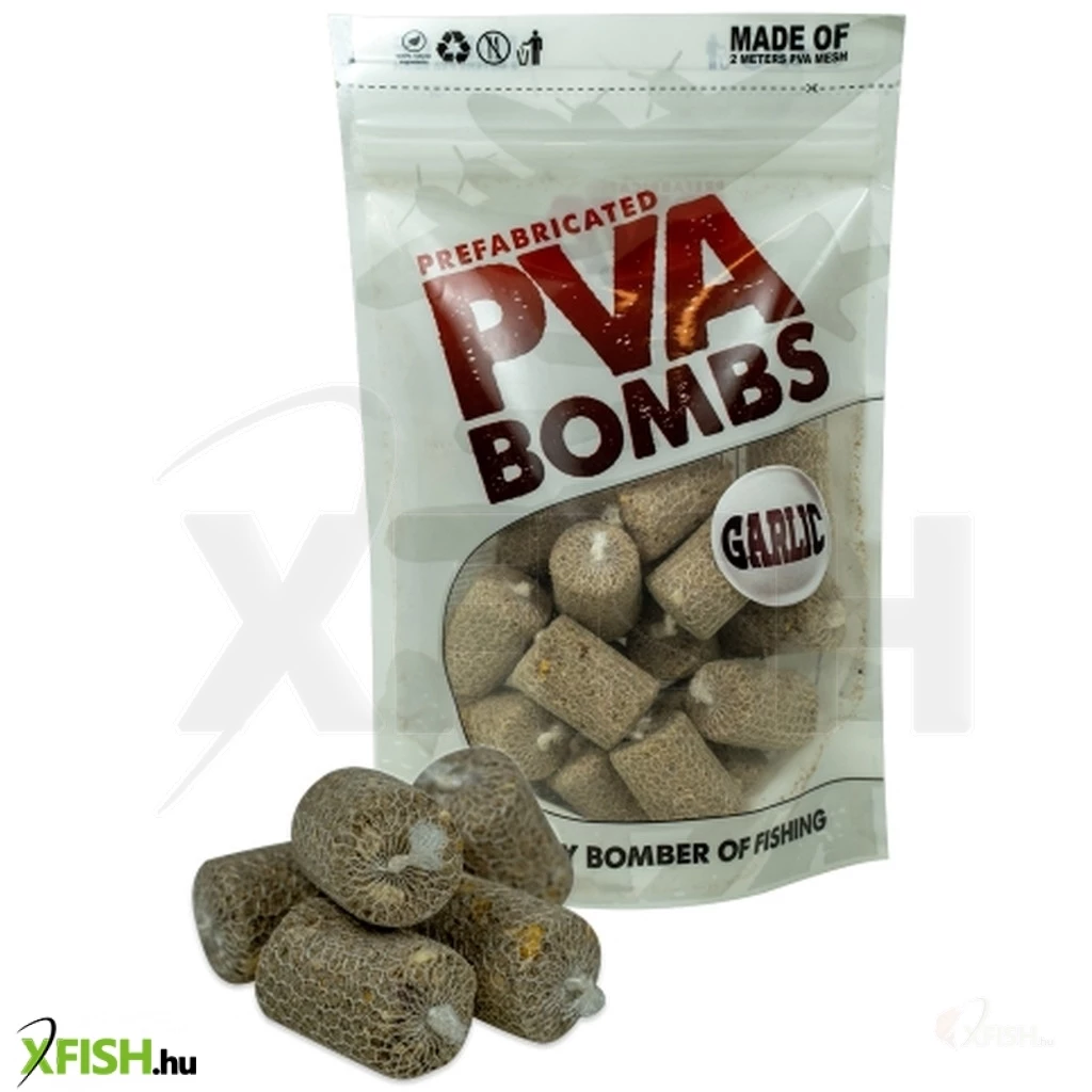 Minden egyes zsákocska mögött hosszú évek versenytapasztalata, több ezer vízparton töltött óra van. A PVA BOMBS a speciális helyzetekhez is igazodva 5 különféle ízben kerül forgalomba, így minden szituációban eredményesen használható, melyek íz és beltartalmuktól függetlenül PVA barát dippel vagy locsolóval még vonzóbbá tehetők. Minden termék a haltakarmányozásban is használt magas minőségű kiváló beltartalommal bíró haltáp-keveréket és hozzáadott aminosavakat, omega-3 zsírsavakban gazdag halolajat és a tápanyag hasznosítást segítő esszenciális olajokat tartalmaz.