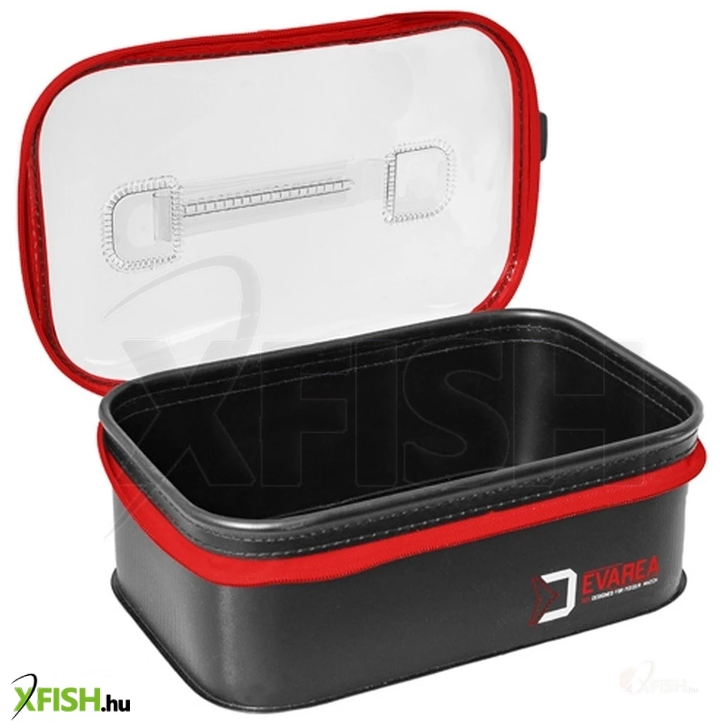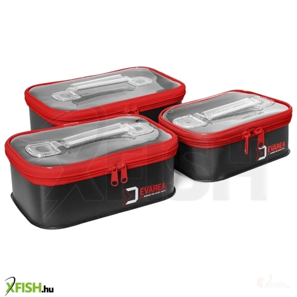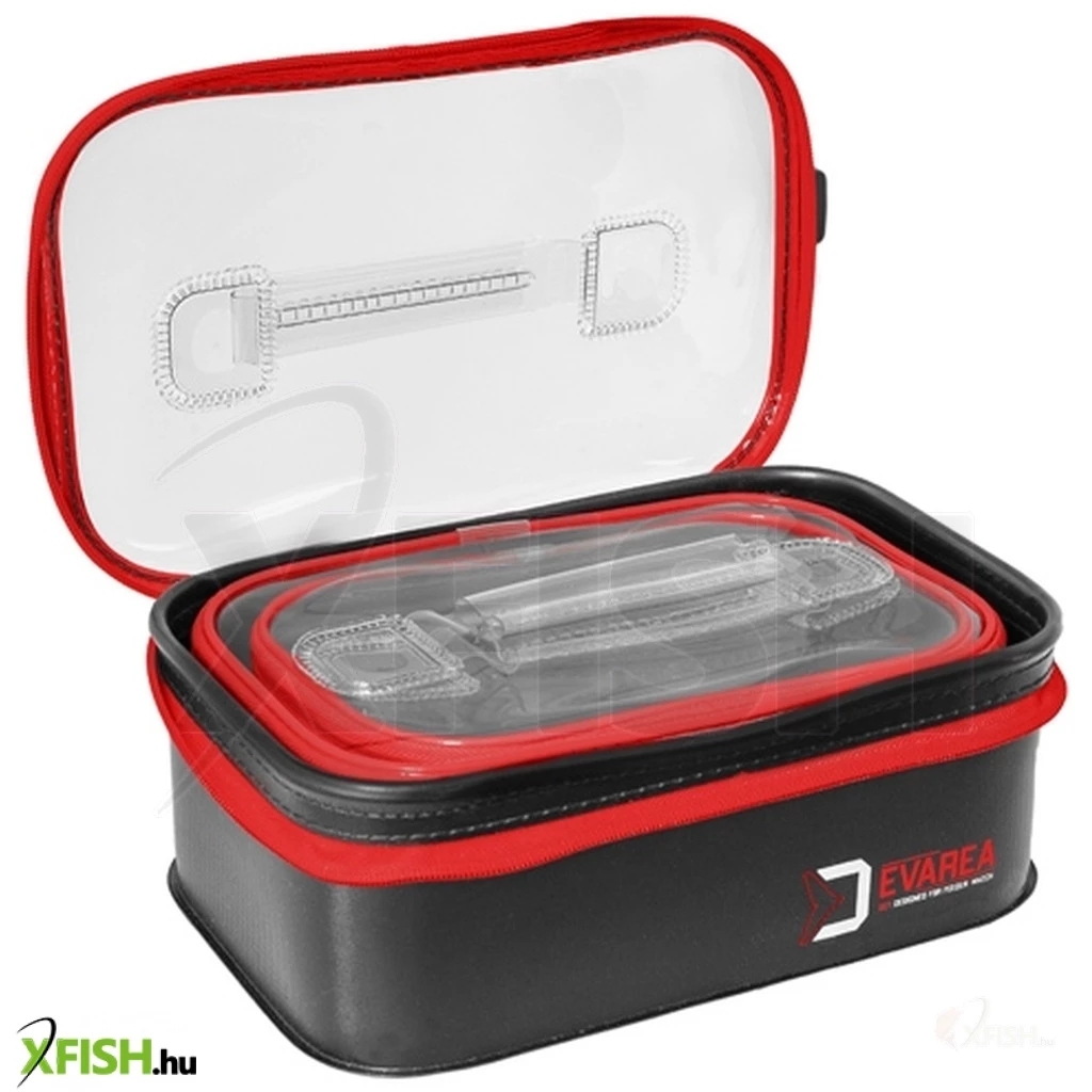 A Delphin EVAREA szett praktikus három szögletes téglalap alakú műanyag táskából áll, különféle horgász felszerelések vagy apró cikkek tárolására. A táskák feketék és piros cipzárral vannak ellátva, amelyek bezárják fedelét. A fedél átlátszó anyagból készül, amely tökéletes áttekintést nyújt a benne levő dolgokról. A fedél tetején praktikus markolat található. Az alsó rész kemény EVA anyagból készül, és ha valami kiömlött a belsejében, nem folyik ki belőle. Moshatóak belülről és kívülről is.