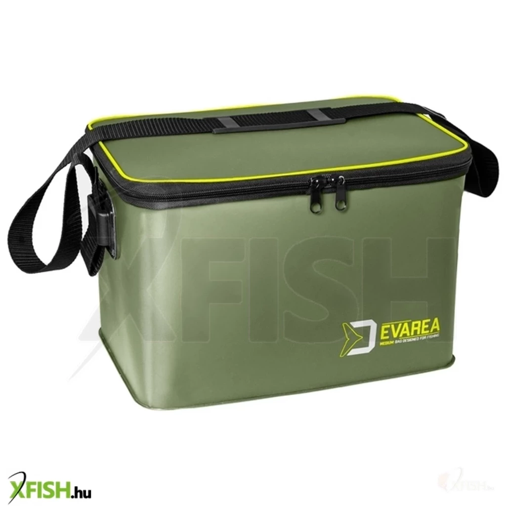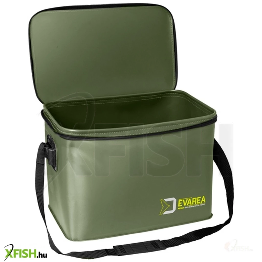 A Delphin EVAREA Medium egy téglalap alakú univerzális műanyag táska 34x22x23cm méretben, különféle horgász felszerelések vagy apró cikkek tárolására. A táska keményített formatartó EVA anyagból készül. A táska matt katona zöld és piros cipzárral van ellátva, ami bezárja a táska fedelét. Az alsó rész vízhatlan műanyagból készül, és ha valami kiömlött a belsejében, nem folyik ki belőle és ha vizes talajra is helyezi nem fog beázni. Moshatóak belülről és kívülről is. A táska fekete vállpánttal van ellátva.