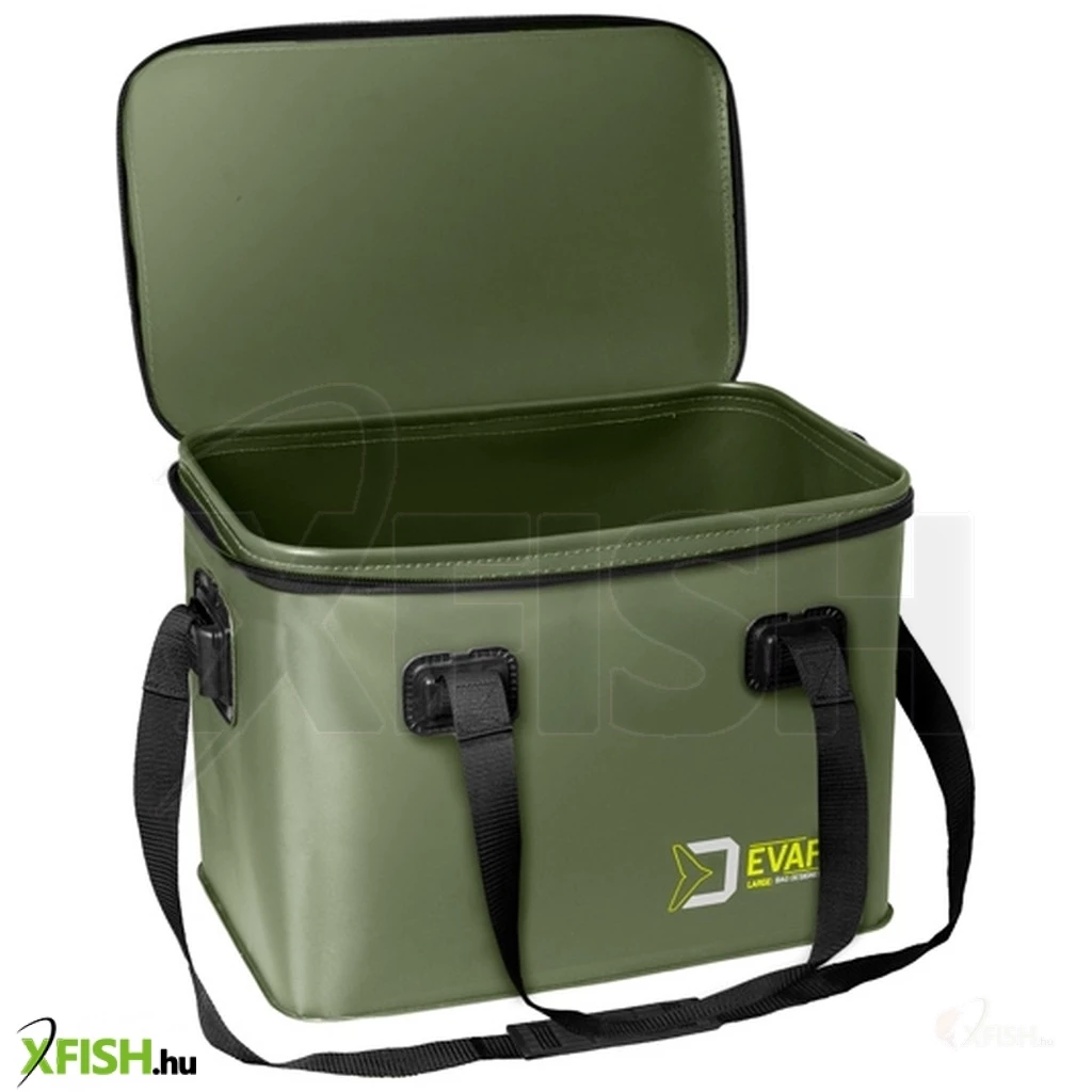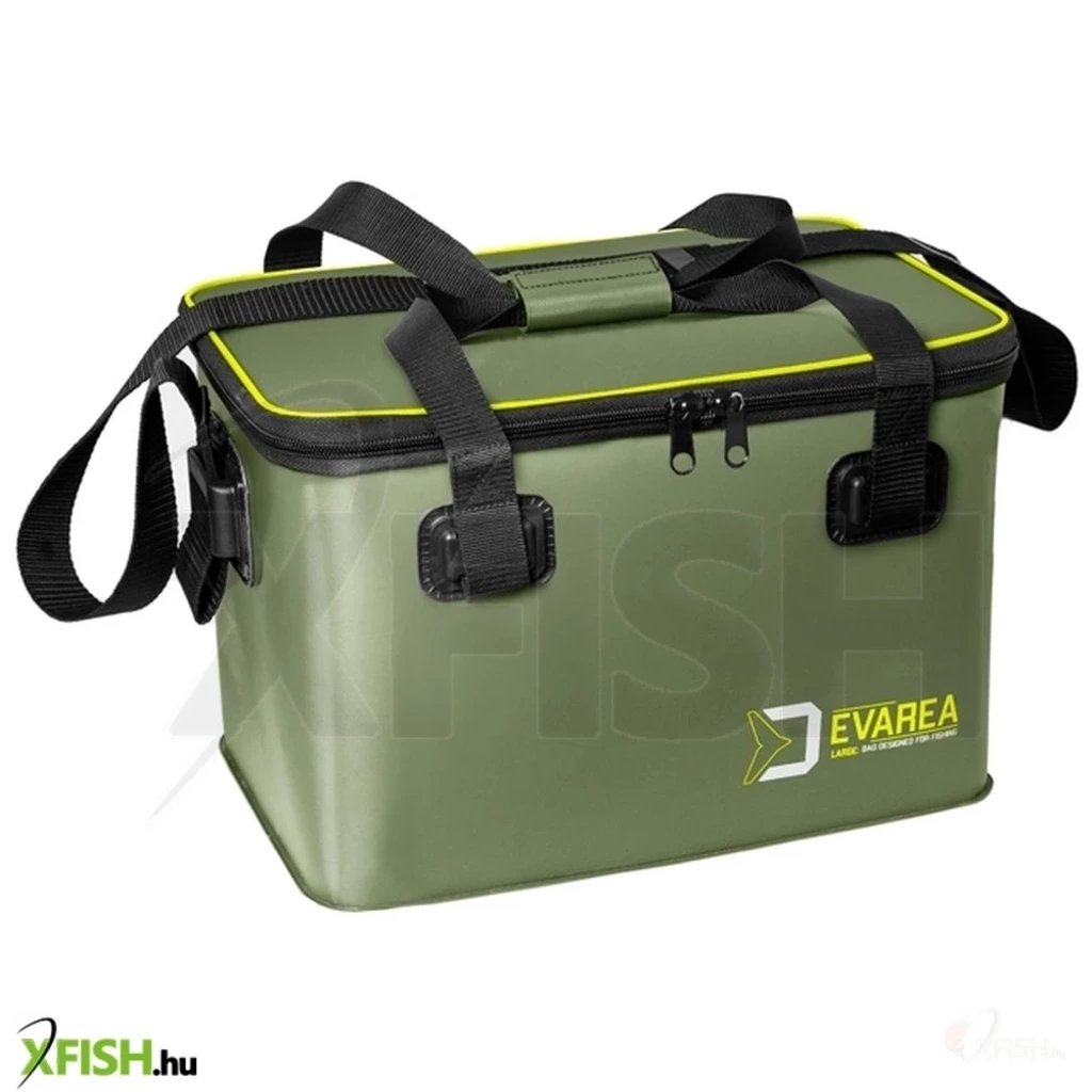 A Delphin EVAREA Large egy téglalap alakú univerzális műanyag táska 50x30x30cm méretben, különféle horgász felszerelések vagy apró cikkek tárolására. A táska keményített formatartó EVA anyagból készül. A táska matt katona zöld és piros cipzárral van ellátva, ami bezárja a táska fedelét. Az alsó rész vízhatlan műanyagból készül, és ha valami kiömlött a belsejében, nem folyik ki belőle és ha vizes talajra is helyezi nem fog beázni. Moshatóak belülről és kívülről is. A táska fekete vállpánttal és fogantyúkkal van ellátva.