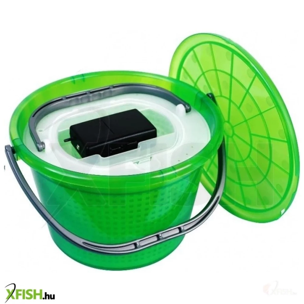 Kiváló minőségű újrahasznosított műanyagból készül, amely ellenáll az UV sugárzásnak. A doboz három részből áll, vödör, kivehető kosár és fedél. A belső kosárnak van egy nyílása a légtömlő számára és egy zsanéros nyílás biztosítékkal. Ennek a terméknek az az előnye, hogy önmagában a vödröt is felhasználhatja az etetőanyag keverésére. Franciaországban Készült. Tartalom: 13 liter Ingyenes levegőztető : Akkumulátorral működtetett levegőztető , amelyet két elem táplál. A motoron hátulról van egy praktikus rögzítője, amely megkönnyíti a rögzítést. Tápegység 2x1,5 V-os R20 "D" típusú elem (nem tartozék) A motor tartozéka, tömlő 50cm és habkő.