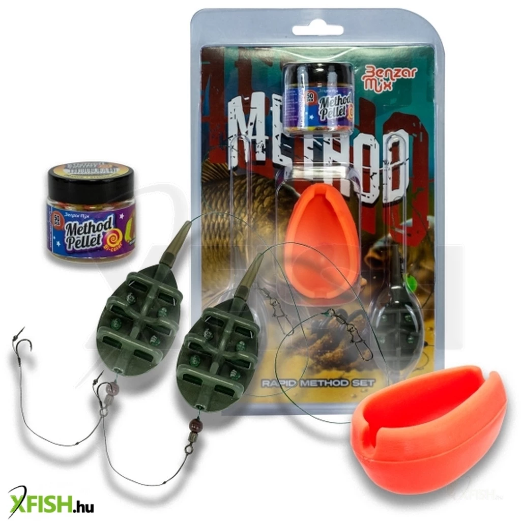 Benzár Rapid Method szettKomplett, előkötött method végszerelék, melyet egy forgókapocs segítségével tudunk rögzíteni főzsinórunkhoz vagy dobóelőkénkhez és már kezdődhet is a peca!