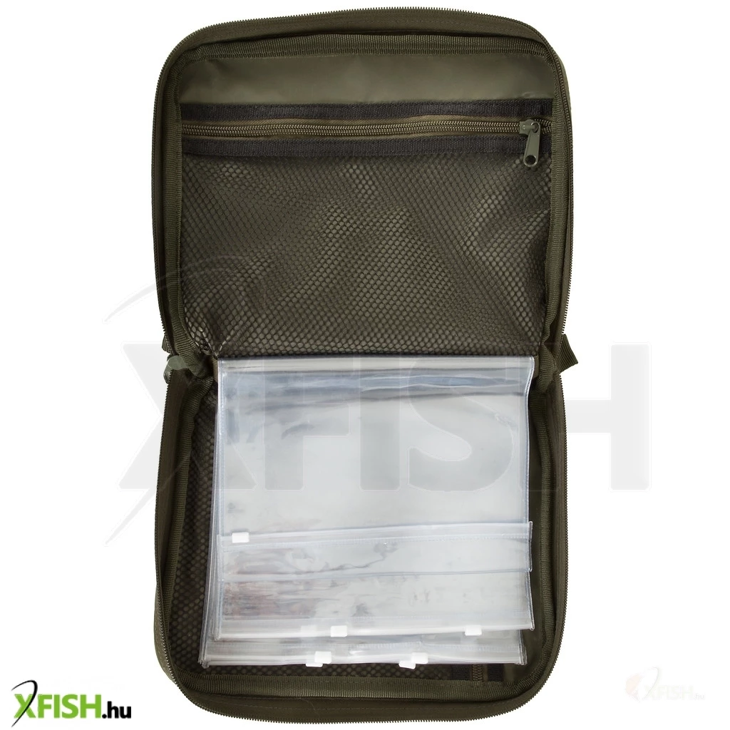 Large easy access main compartment with 8 high quality plastic sleeves for rig items and two mesh pockets with zip access.