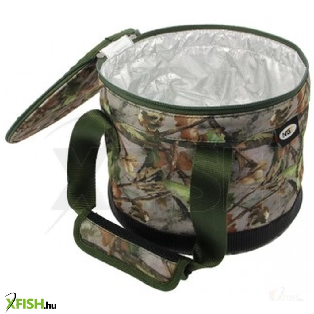 A deluxe camouflage insulated green 'bait bin' with twin handles and zip up top. Ideal for particles, boilies and pellets. Folds down easily when not in use. Made from waterproofed 840D polyester with PVC backing.