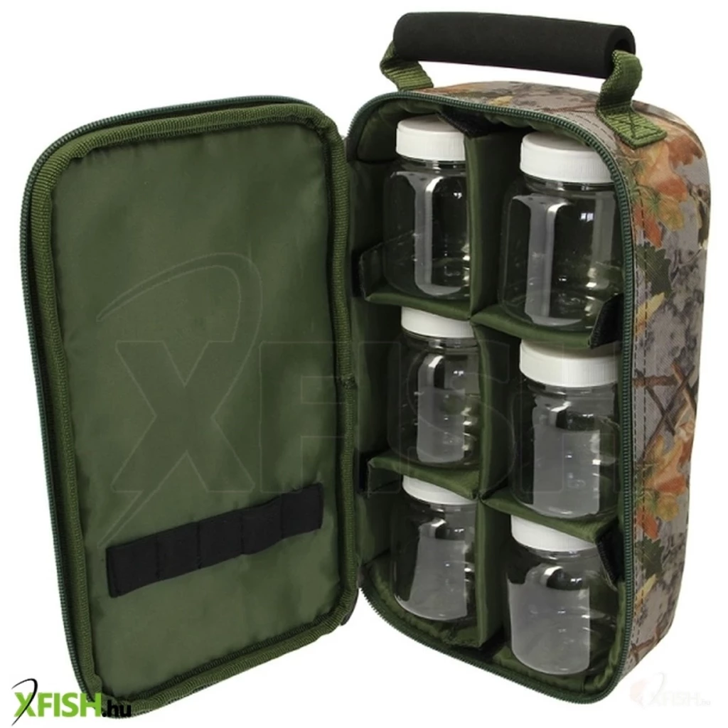 A 6 pot camouflage glug bag (6 glug pots included) and well padded carry handle made from 600 polyester with PVC backing.