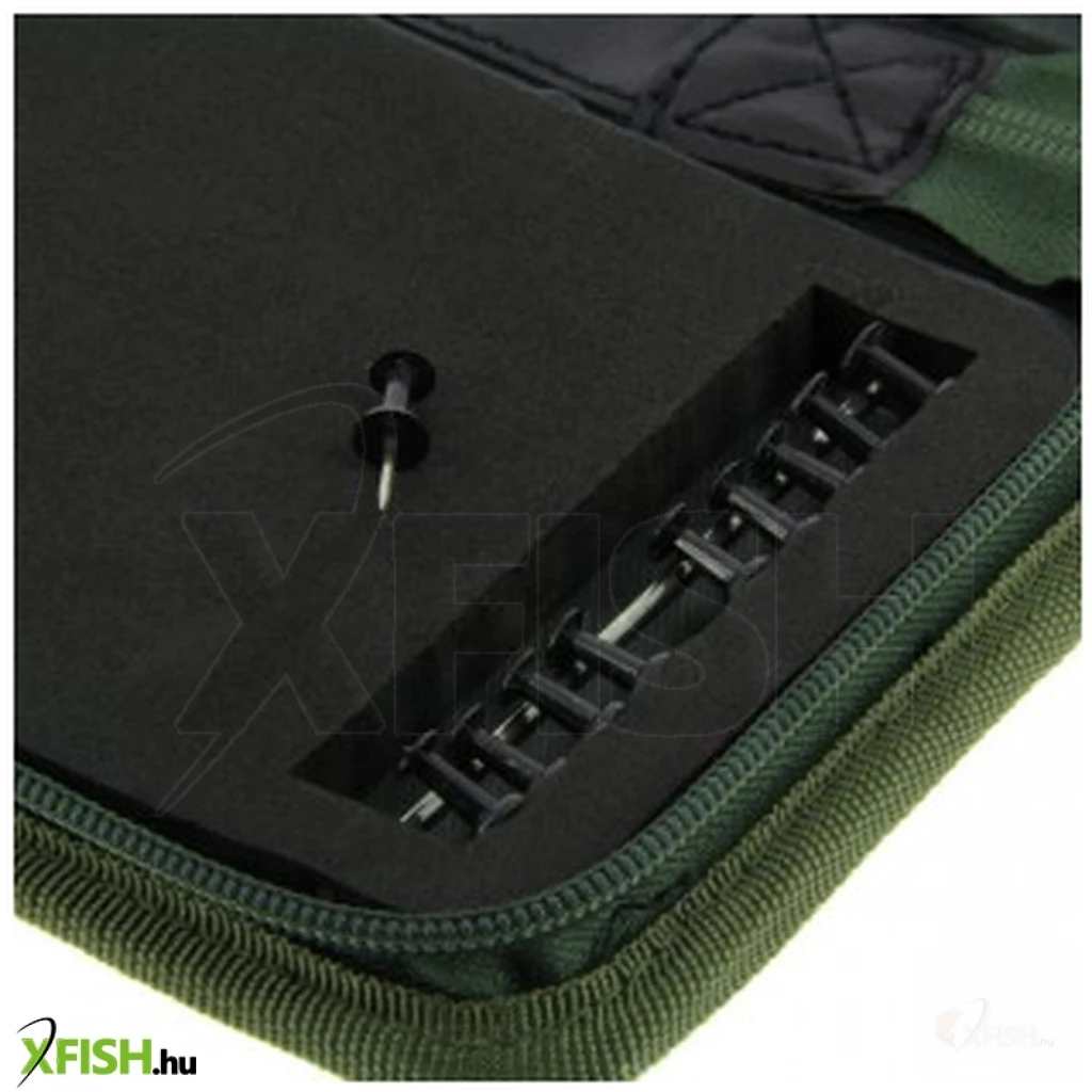 Zöld színű, 20 férőhelyes merev előketartó. (Csapok mellékelve.) Ideális kész kötött előkék tárolására. (600D poliészterből készült, PVC hátlapdal.)