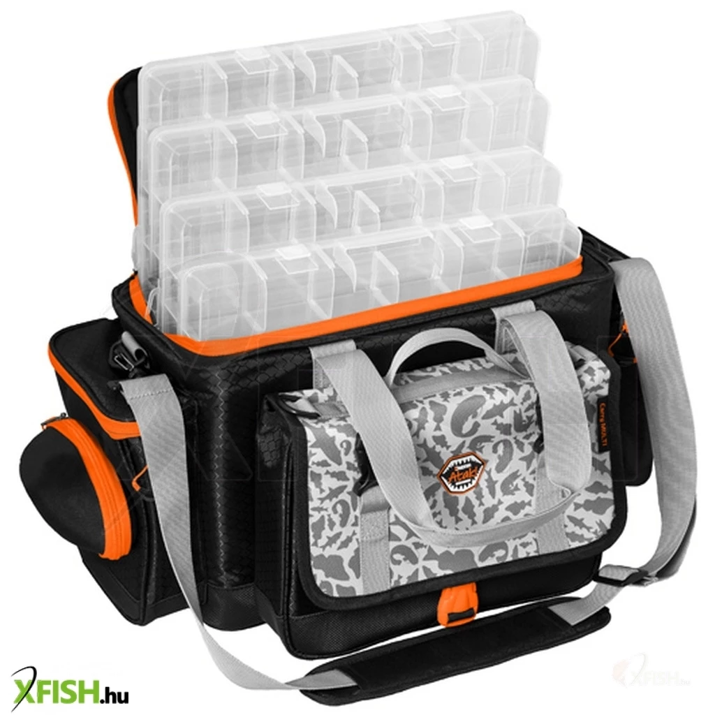 A táska szürke ATAK! terepmintás dizájnja ragadozóhal sziluettekkel díszített, még inkább kihangsúlyozva a horgászat izgalmát. Kényelmét fokozza, hogy a táska hordozható vállpánttal vagy a két szürke kézi fogantyúval.