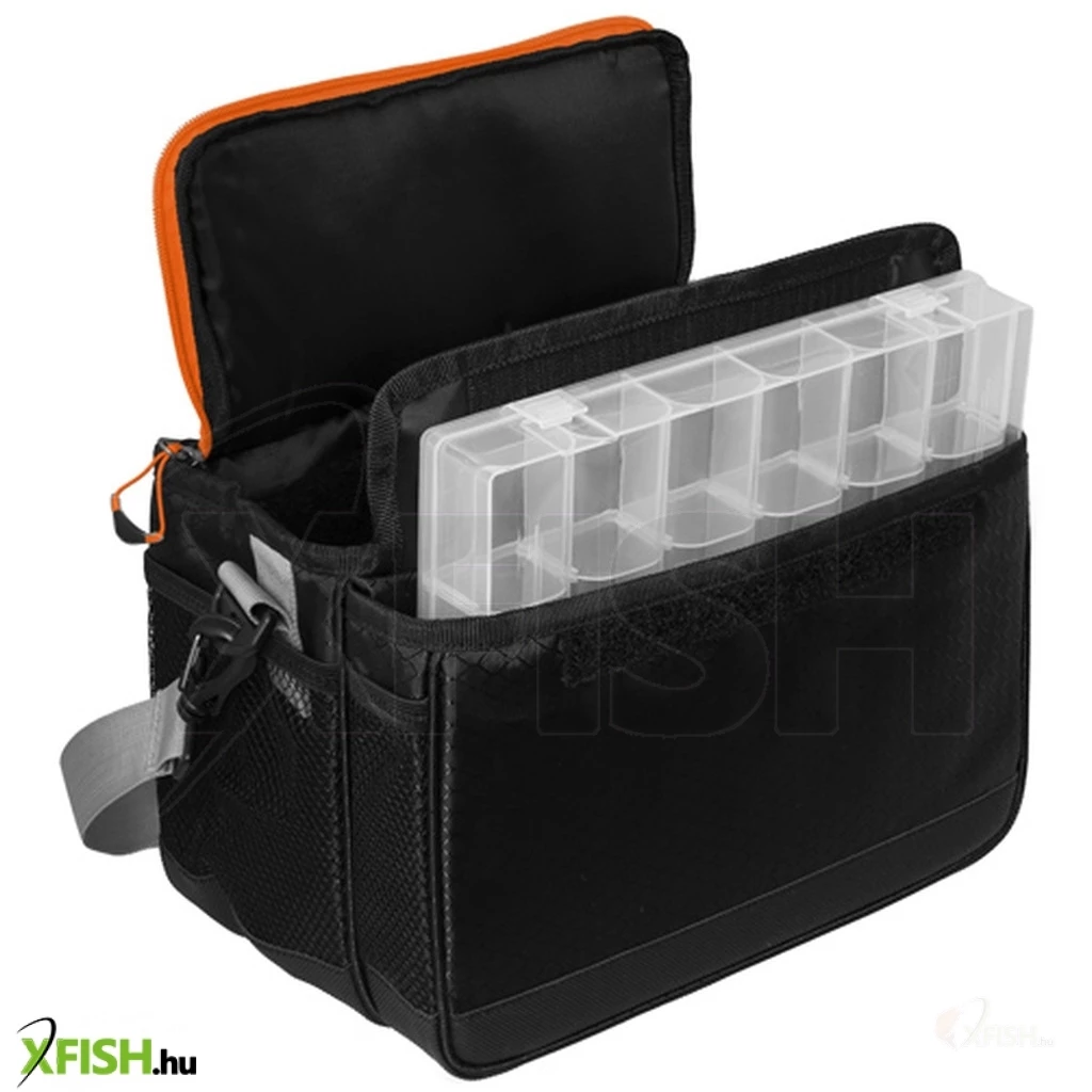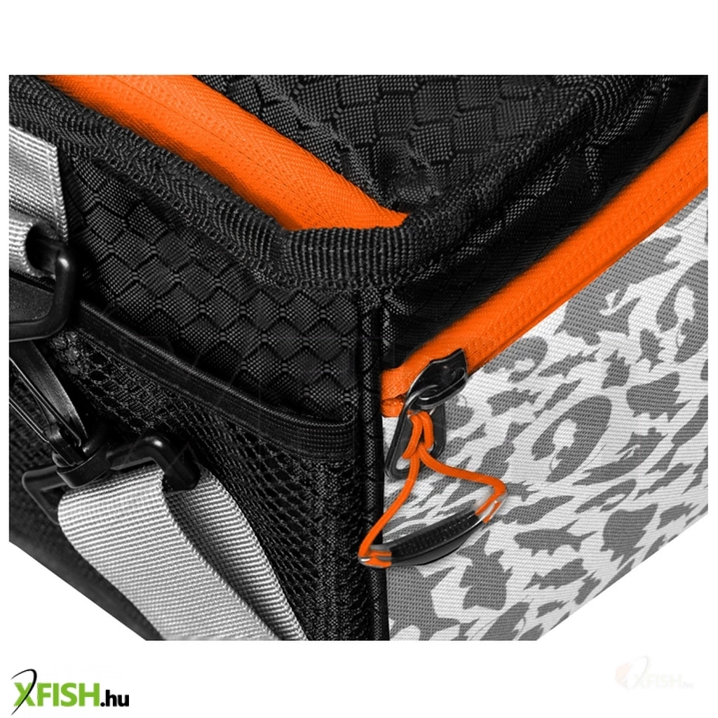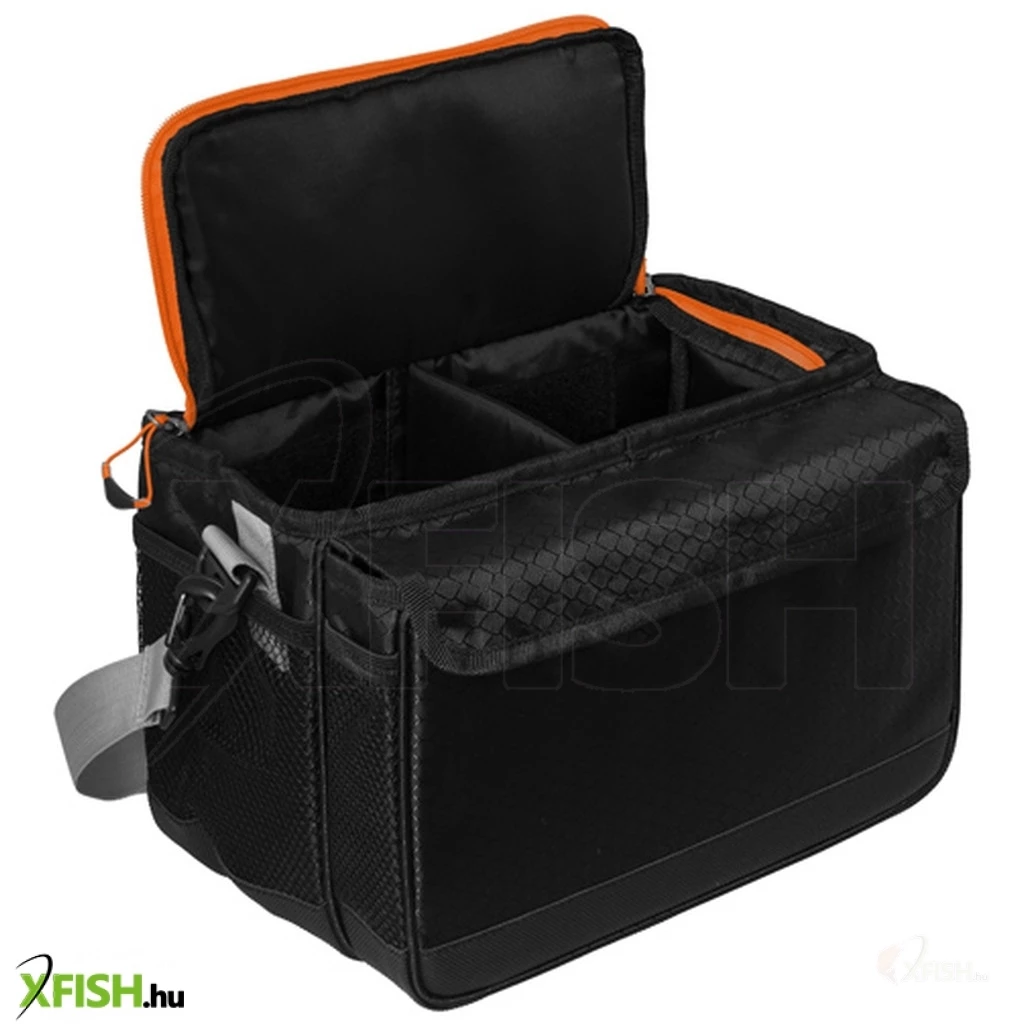 A táska belső tároló részét egy tépőzáras válaszfallal személyre szabhatja, így mindig a saját igényeinek megfelelően rendezheti be. Az oldalsó hálós zsebek kiválóan alkalmasak kis méretű tárgyak tárolására, míg a hátsó részben található tépőzáras zseb tartalmaz egy műanyag, kivehető válaszfalas dobozt, amely a táska tartozéka. Az elején található cipzáros zsebbe pedig praktikus megoldásként akár a horgász igazolványát is beteheti.