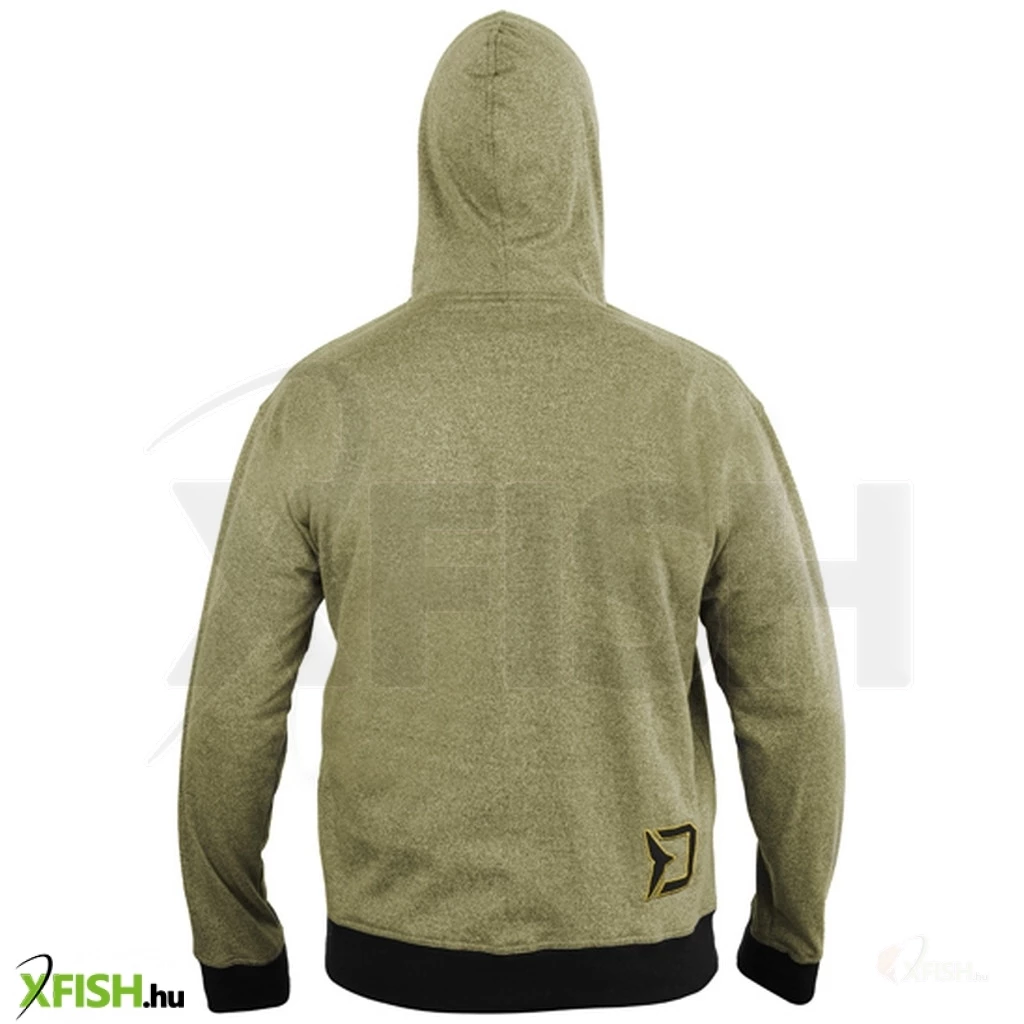 A Delphin RAWER ONE TacklePocket egy stílusos kapucnis pulóver, amely a kényelem új dimenzióját hozza magával. Sötétzöld színben kaphatók, és a derékon és az ujjakon fekete mandzsetta egészíti ki. A sorozat megkülönböztető tulajdonsága minden bizonnyal az elülső tágas TacklePocket dupla cipzáras zseb, amelyet úgy alakítottak ki, hogy a horgász kényelmesen el tudjon helyezni benne mindent amire szűksége van. Ennek a terméknek a magas minőségét bizonyítja a felső kategóriás YKK cipzár használata is. A cipzárfülek Delphin logóval vannak kiegészítve. A cipzár mindkét végén mindkét oldalon találékony módon lyukakat helyeztünk kezek behelyezéséhez a zseb mögötti helyre, ahol hideg esetén felmelegítheti a kezét. Elülső részén található egy nagy Delphin logó, ízléses zöld szegéllyel. A jobb hátsó oldalon ugyanazt logót kisebben találjuk. A kapucni belső része egy fekete szövet került Delphin logóval nyomtatva. A kapucni könnyen összehúzható a fekete fűzővel, amely végei Delphin RAWER logóval vannak díszítve. Ugyanez a logó nagyobb méretben megtalálható a bal alsó sarokban lévő mandzsettára varrva.