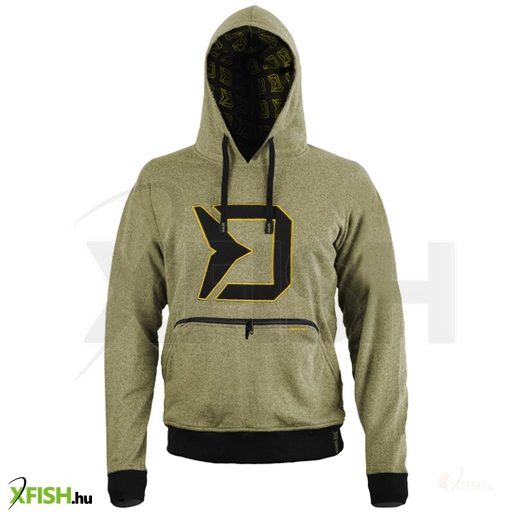 A Delphin RAWER ONE TacklePocket egy stílusos kapucnis pulóver, amely a kényelem új dimenzióját hozza magával. Sötétzöld színben kaphatók, és a derékon és az ujjakon fekete mandzsetta egészíti ki. A sorozat megkülönböztető tulajdonsága minden bizonnyal az elülső tágas TacklePocket dupla cipzáras zseb, amelyet úgy alakítottak ki, hogy a horgász kényelmesen el tudjon helyezni benne mindent amire szűksége van. Ennek a terméknek a magas minőségét bizonyítja a felső kategóriás YKK cipzár használata is. A cipzárfülek Delphin logóval vannak kiegészítve. A cipzár mindkét végén mindkét oldalon találékony módon lyukakat helyeztünk kezek behelyezéséhez a zseb mögötti helyre, ahol hideg esetén felmelegítheti a kezét. Elülső részén található egy nagy Delphin logó, ízléses zöld szegéllyel. A jobb hátsó oldalon ugyanazt logót kisebben találjuk. A kapucni belső része egy fekete szövet került Delphin logóval nyomtatva. A kapucni könnyen összehúzható a fekete fűzővel, amely végei Delphin RAWER logóval vannak díszítve. Ugyanez a logó nagyobb méretben megtalálható a bal alsó sarokban lévő mandzsettára varrva.