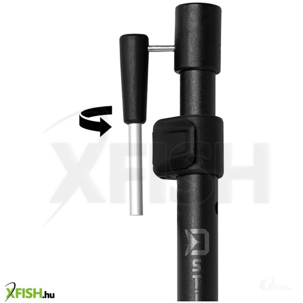 A Delphin D-STICK teleszkópos leszúró bottartó fúróspiccel. Már az első ránézésre látható a robusztus, mégis könnyű termék prémium kivitele. Alapját vastagfalú csövek képezik melyek szilárdak, fekete mat felületkezelése biztosítsa a hosszú élettartamot. Ez a modell innovatív széthúzó és rögzítő mechanizmussal készül, mely minőségi ABS műanyagból gyártódik. Ez az átdolgozás egyszerűsítette a kezelését és egyúttal bebiztosítsa, hogy a bottartó ne tolódjon magától össze. A leszúró alsó részén masszív fúró hegy található, amely lehetővé a bottartó keményebb alapokba történő lefúrását is. A fúró hegy rögzítése csappal (szegeccsel) van megoldva, ezáltal nem áll fenn annak a veszélye, hogy a fúróhegy a földben ragad és Önnek egy használhatatlan bottartója marad! Ennek a rögzítési módnak a legnagyobb előnye a szilárdsága és ereje. A bottartó felső részén egy kar található, amelyet az alsó részbe kell behelyezni, és ennek segítségével fúrás során erőkifejtésre alkalmas karként szolgál. A bottartó felső részén masszív menetes fej van, melybe bele tudja helyezni a bottartó fejet vagy az elektromos kapásjelzőt.