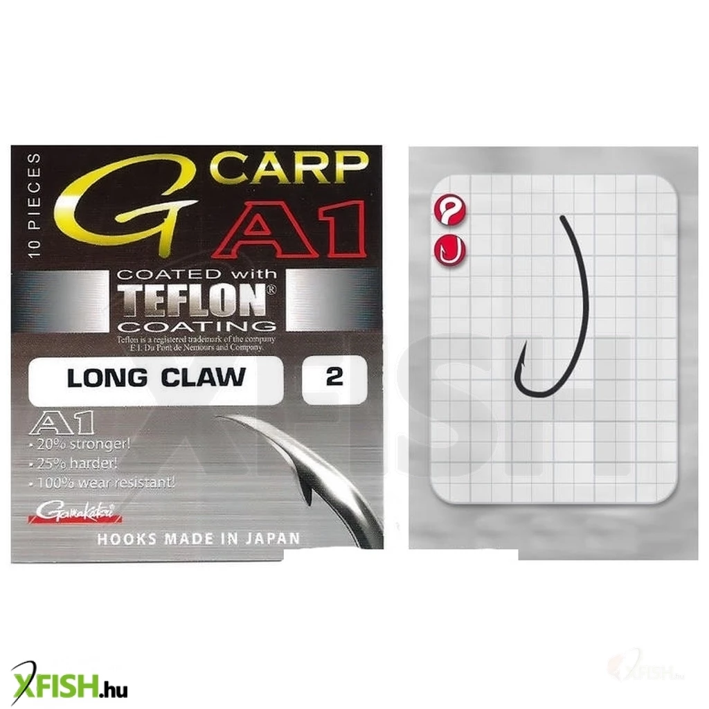 A G-Carp A1 Long Claw horog vékony huzalból készül, nem túl szembetűnő, borotvaéles és befelé mutató horogpontja van. A hosszú, hajlított szár és rövid hegy nagyon erős akadást biztosít.
