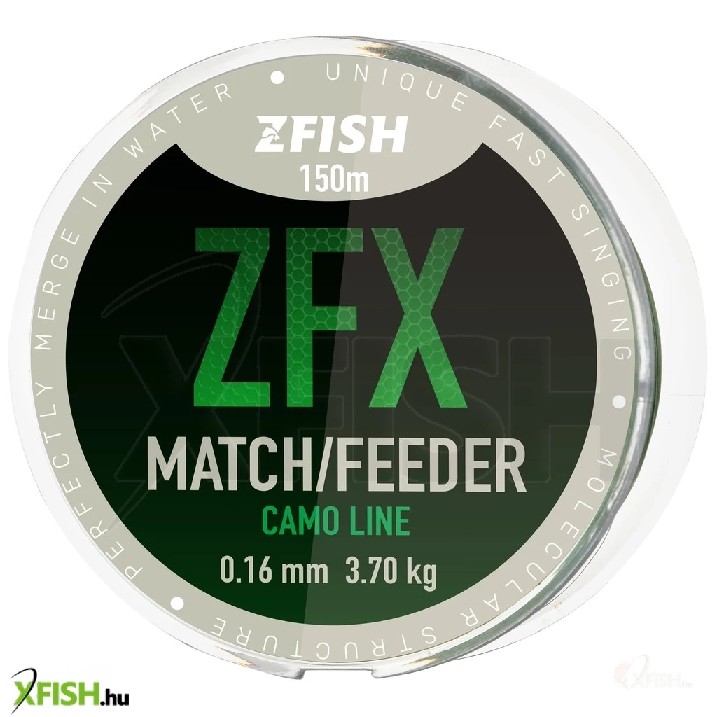 ZFISH vonal ZFX Match / Feeder CamoLine ez egy egyedülálló, gyorsan süllyedő zsinór feederezéshez és úszózáshoz is egyedülálló CAMO tulajdonságokkal. Ez a különleges zsinór egyedülálló eljárással készül, amelyben a mikrorészecskék molekuláris szerkezetét valósítják meg a zsinórban, és ez az anyag teljesen egyedi megjelenését és vizuális tulajdonságait eredményezi. Ez a zsinór tökéletesen és természetesen illeszkedik a víz alatti környezethez és a planktonhoz, és gyakorlatilag láthatatlanná válik a halak számára, és egyáltalán nem zavarja őket. További fontos jellemzői az alacsony nyúlás, a már említett gyors merülés, nagy teherbírás és kopásállóság.