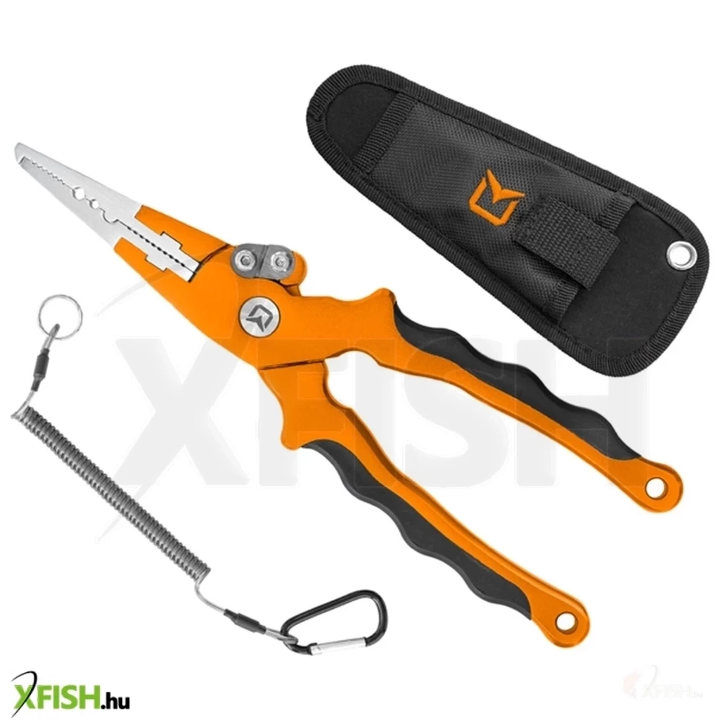 Alaposan kidolgozott multifunkciós fogó, mellyel gond nélkül megoldja a gyűrűk nyitását, krimpelő csövek összenyomását vagy különböző damilok és fonott zsinórok nyírását. Ráadásul elegendően hosszúk a pofák, hogy ki tudja venni a horgot a ragadozó halak szájából. Rozsdamentes acélból készült, a fogó részen csúszásálló gumi bevonat van. A SpinSET fogó övre csatolható tároló fekete tokkal kapható. Ezen kívül rúgós rögzítő huzallal melynek karabiner van a végén a csomagolás része.